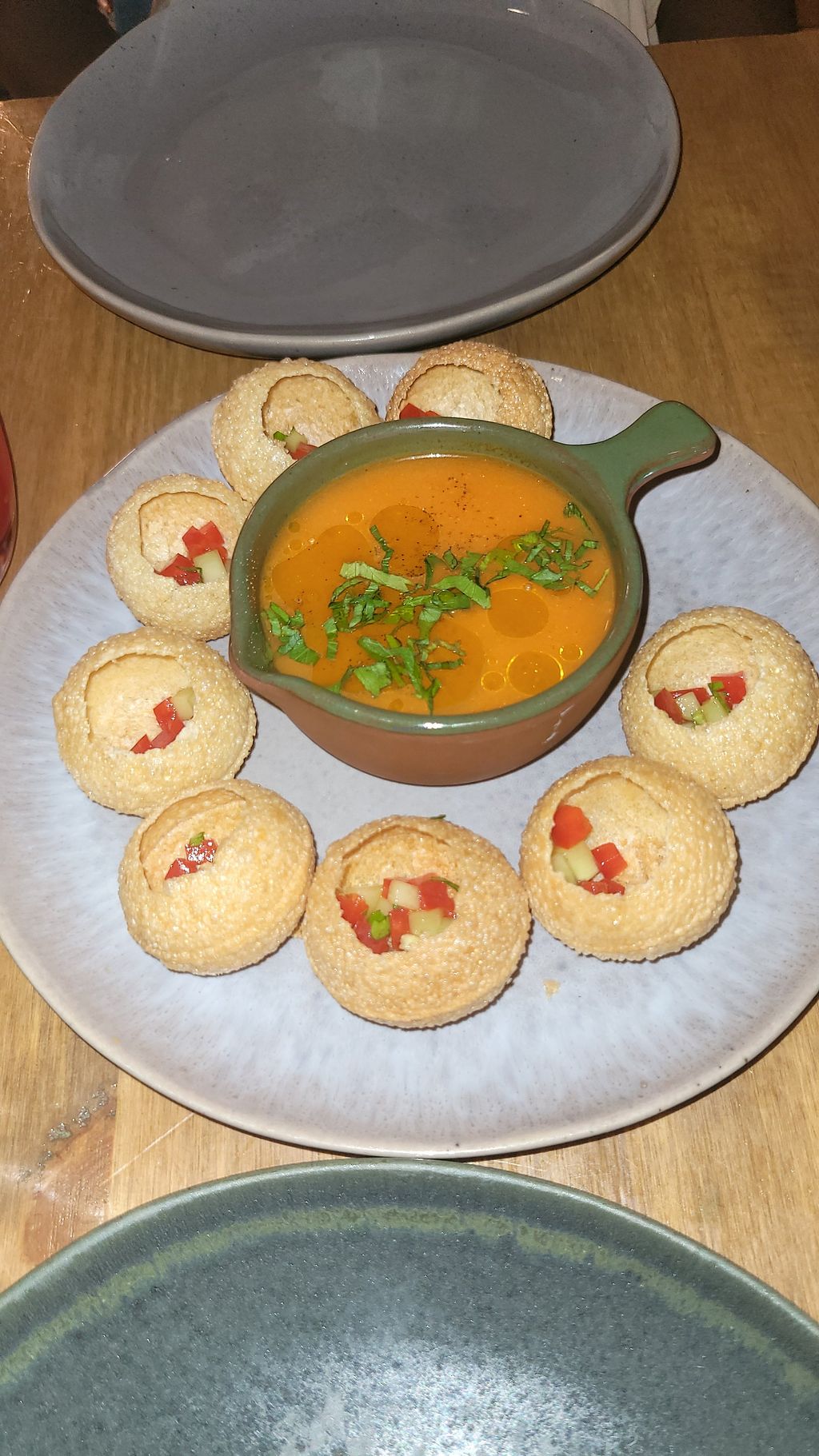 Heard about this restaurant in all the vegan blogs and loads of TikToks that I watched in preparation for my trip to Lisbon, so knew it was a must-visit place! The staff were simply fantastic and made it such a lovely experience. We unexpectedly arrived early and had booked to sit outside, but unfortunately it was raining. They found us seats undercover out of the rain even though we were early (and happy to wait). The food was great and so very reasonably priced for what you get. Very tasty and extremely Instagram-friendly! We had the Pani Puri Gaspacho to start which was packed with flavour and a great novelty eating experience. For mains we shared two starters; ‘scallops’ made from oyster mushrooms and the gochujang cauliflower, and one main dish, the Gado Gado. All dishes were exquisitely presented and had balanced, powerful flavours. Unfortunately my sister became ill and we had to cut our meal short but the waiting staff were so brilliant at getting our bill quickly and giving us takeaway containers for the leftover food and a dessert (the sneaky slice, which was just as nice the next day!)