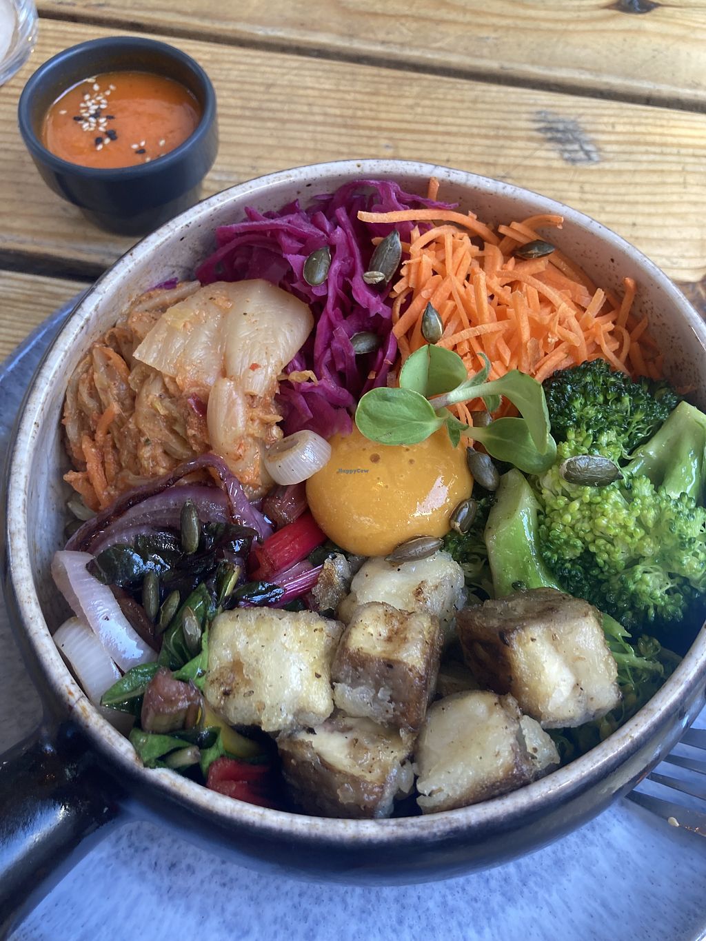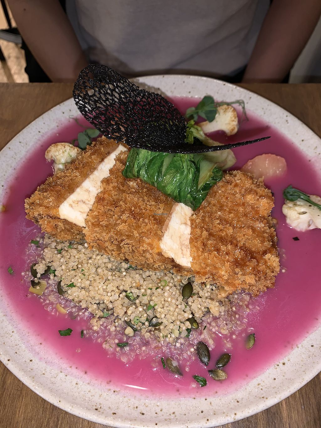 This place was great. Had the oyster mushroom and yellow beetroot lettuce tacos which was probably the dish of the night, even if I couldn't pick out the beetroot. Also had the sweet and sour cauliflower as a 2nd starter which was tasty but not anything special. Bimimbap main again not bad. It came with a vegan egg yolk which looked the business but didn't really taste of much. Rose and coconut pannacotta tasted better the more I ate, though not quite the texture of a traditional pannacotta. Would definitely recommend but make sure you book