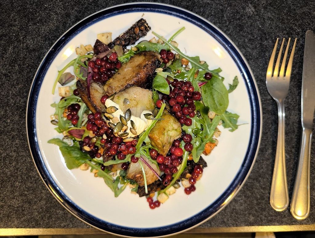 Potato dumplings, lingon berries, tempeh, root vegetables, rocket
