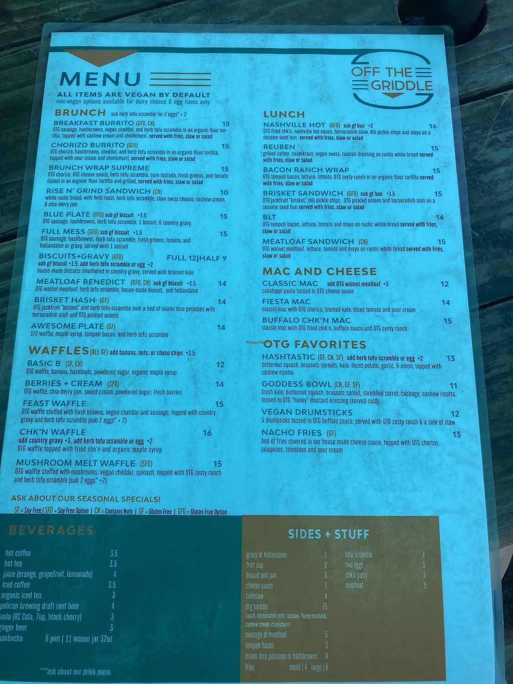 Always loved Off The Griddle. Had a great brunch and it was nice that they have both vegan and veggie options. Service was excellent.