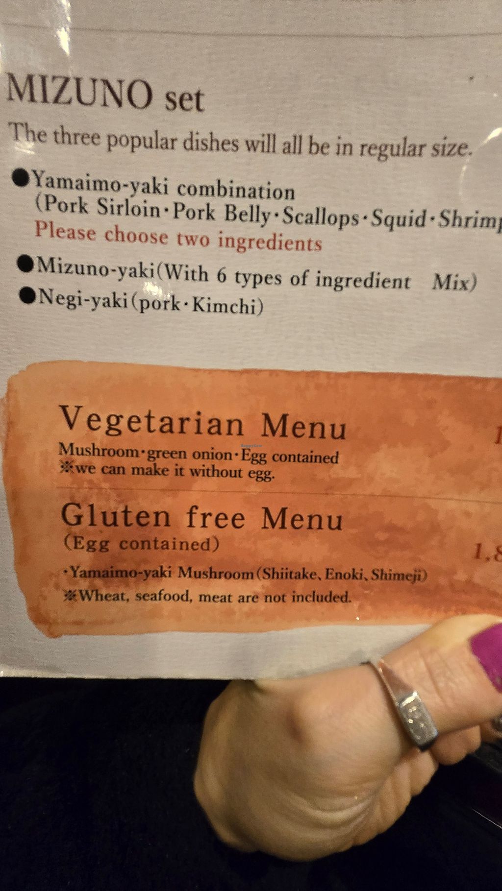 I was very disappointed. Shared grill surface. The cook used separate tools to flip the pancake, but she uses the same sauce brush on ALL food so what difference does it make? Stay away if you care about cross contamination.