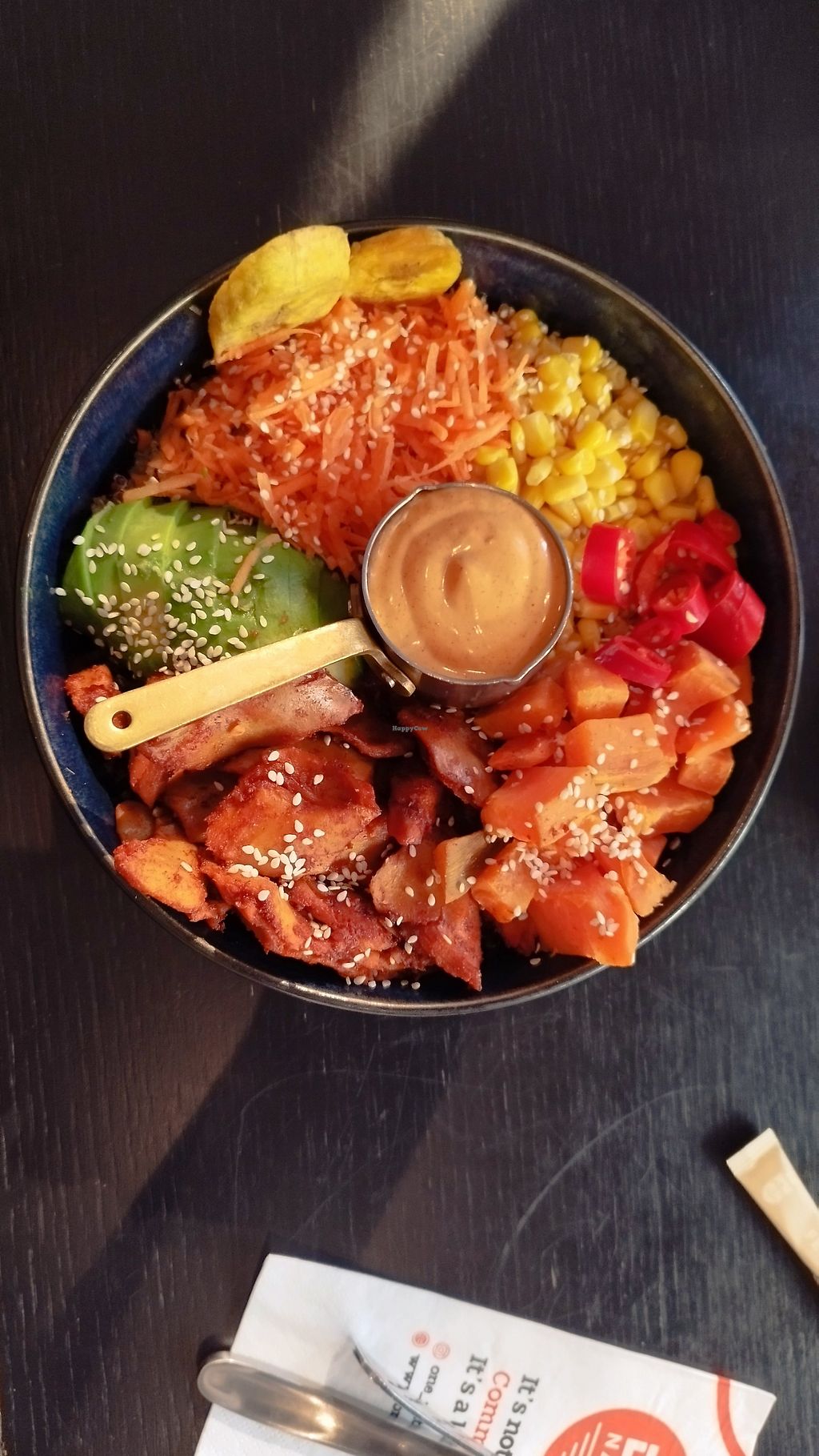 Ordered a smoothie bowl and a savoury vegan bowl and that green avocado spinach smoothie was the smoothest and most delicious one I've ever had in Germany. On the other hand, the savoury bowl with quinoa, sweet potato, a few slices of avocado, corn, fake chicken and grated carrots was very basic and way too expensive for almost 15 €, even though the portion was huge.