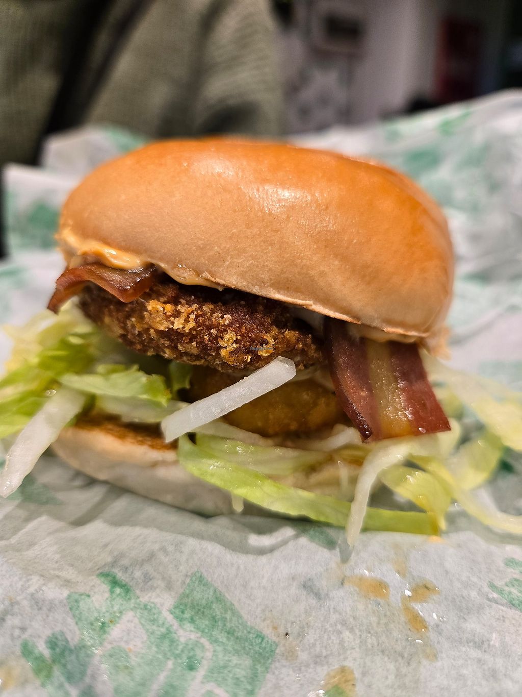 Read moreWe ordered the Spicy Flirt—an Impossible beef patty layered with grilled halloumi, chilli jam, and gherkins—and the BBQ Smokestack, stacked with BBQ sauce, American cheese, onion rings, gherkins, lettuce, and added a glorious hash brown. Both were made into meals with crispy fries and a can of soda, and we couldn’t resist adding chilli cheese nuggets and chick’n tenders on the side.