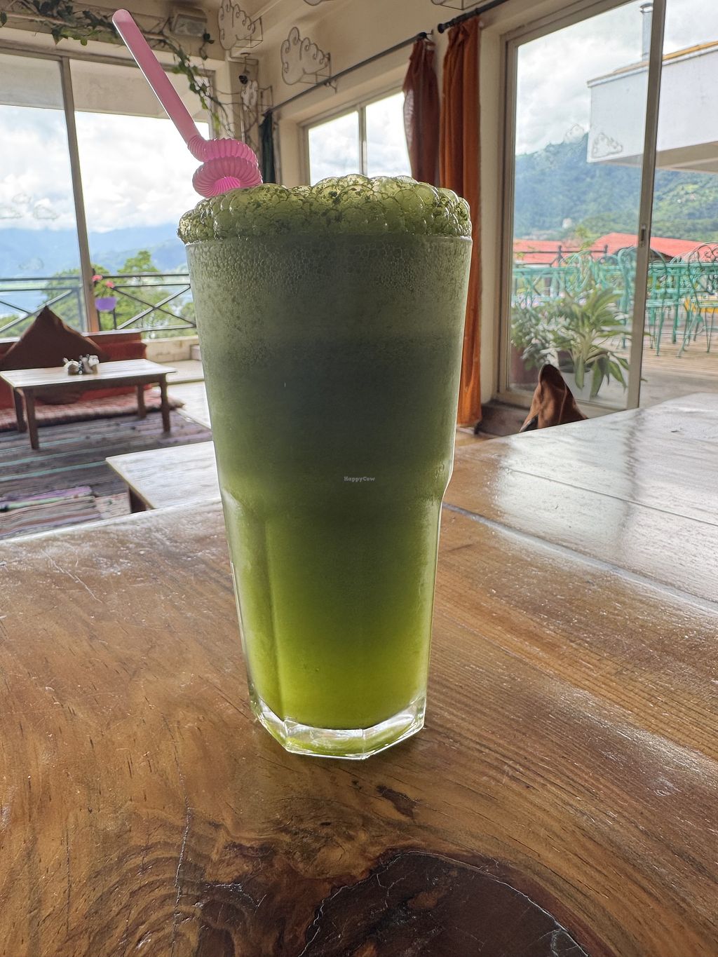 We were craving a bit of vegan junk food and ordered the vegan meat pizza and it satisfied but also in a healthy way. The people next to us ordered the Buddha bowl and gave us food envy. Looked amazing. The view over the lake with he Himalaya in the clouds was magic.