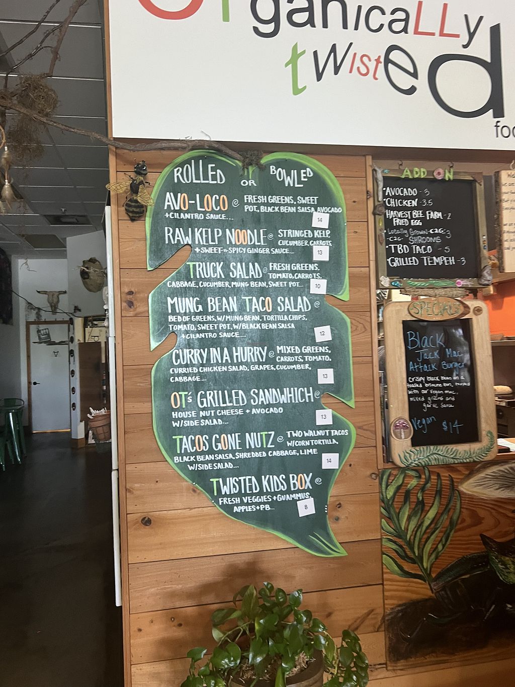 I'll start out by saying the food tasted great, but during the course of our meal we realized, "We've been scammed!" Their name is Organically Twisted, which is what drew us to the restaurant, assuming we were getting organic food, yet we realized they don't state anywhere that their food is organic. It's not anywhere on their menu, not on signage in the restaurant, nor is it anywhere on their website. That would be like selling organic grass fed beef, while omitting that reference on the label. Why would you do that? When I asked the girl at the counter if their food was organic, her yes answer didn't even pass my visual lie detector test. Plus we even questioned how they can sell an "all organic chicken salad" with a half dozen ingredients, for less than other restaurants sell a fried chicken sandwich and fries. It's like a snack I recently purchased that stated, "Made With Organic Coconut", and that was the only organic ingredient, while the list contained high-fructose corn syrup and a bunch of other ingredients I would never eat.