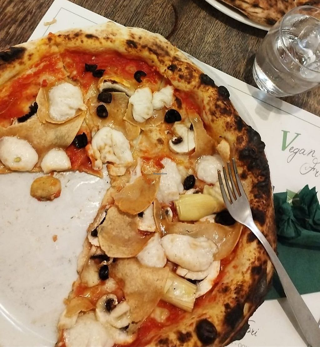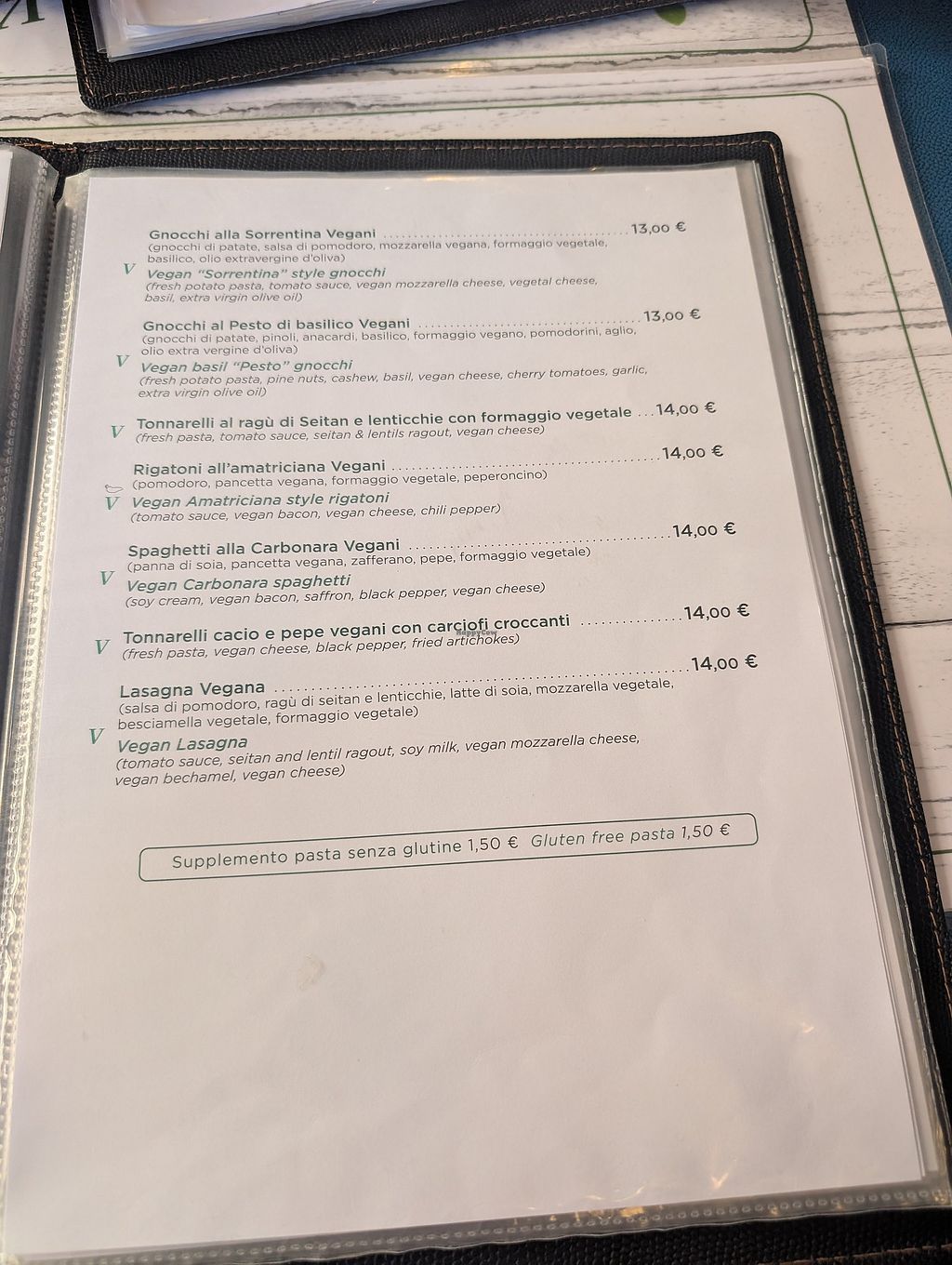 We’ve had much better pizza there than in some other (fully vegan) places in Rome. We’ve had pizza diavola and capricciosa. Both were excellent, delicious and even the vegan mozzarella and salami were very tasty (not the usual non quality coco fat cheese we usually get on vegan pizza). I sincerely recommend visiting this place. The stuff is very helpful and vegan dishes are clearly labelled. There are vegan choices of antipasti, primi, secondi and even desserts.
