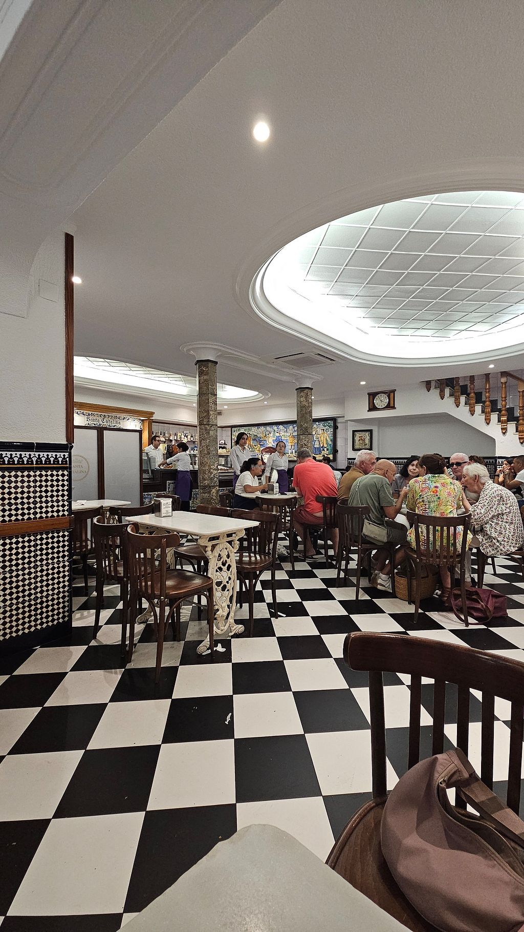 Really neat spot, but very touristy, so service is more rushed than typical in Spain (you pay when you order and seem expected to leave right after you finish). We asked if there was chocolate “sin leche” and were told they could make it with water (called chocolate frances on the receipt) but no plant based milk alternatives. Churros, chocolate, and horchata were good, a nice snack.
