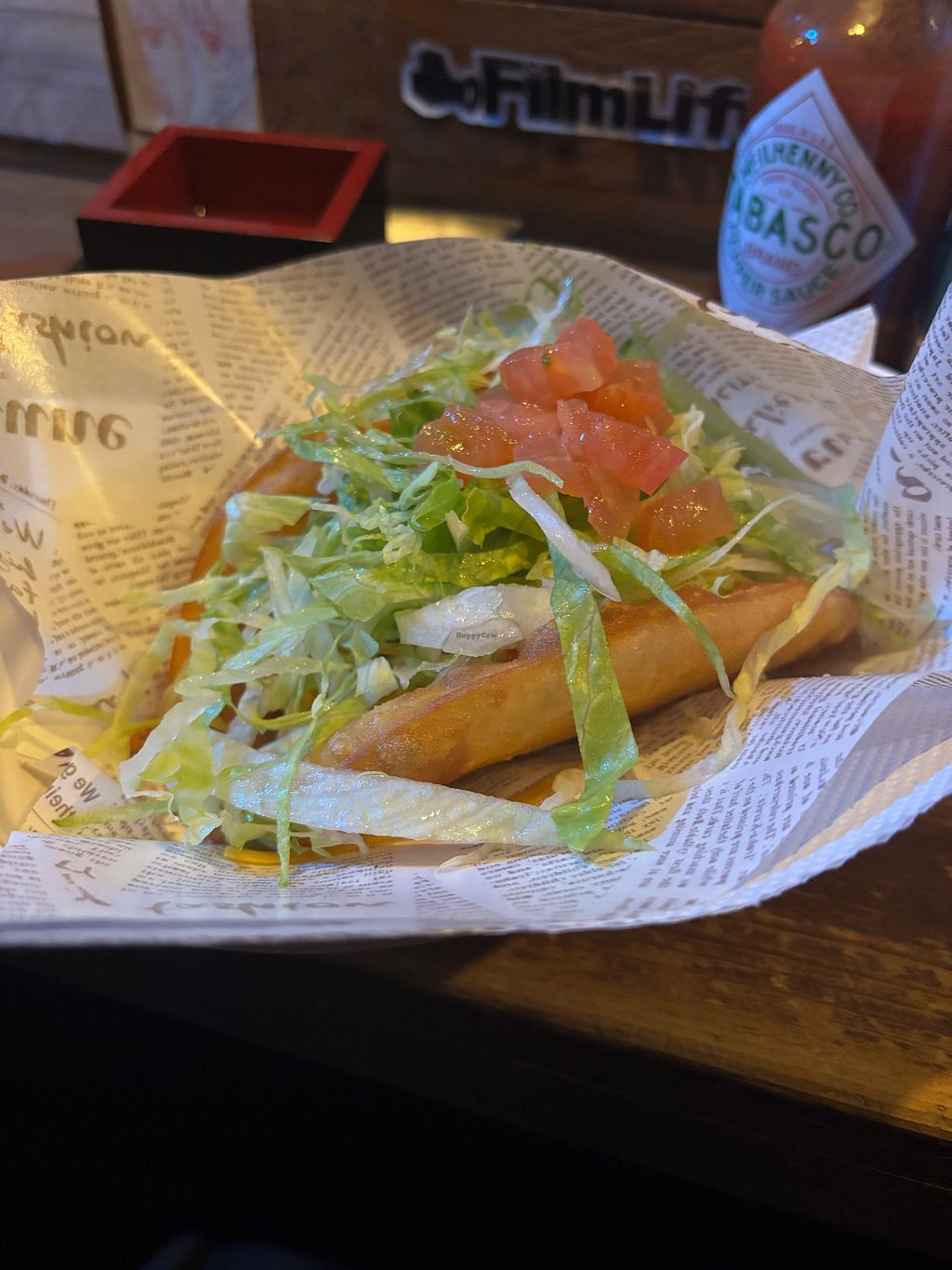 Got a vegan taco that has a deep fried shell - so delicious! - soy mine and a good salad w dressing. Finger licking tasty. The place is real cool and the two men who work there are great fun, it’s worth the trip.