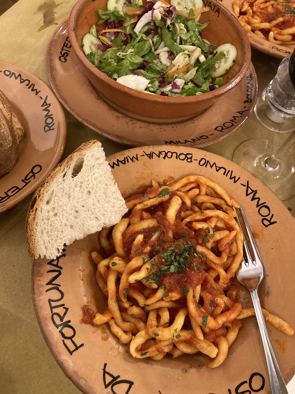 Frisch hergestellte Pasta (vor Ort, man kann zusehen) mit Arrabbiata-Pasta und typischen veganen Beilagen / Vorspeisen