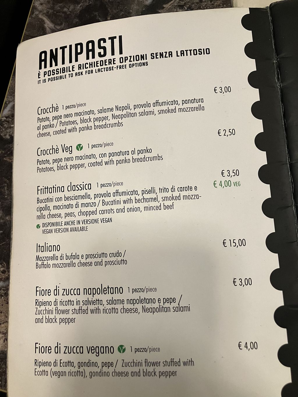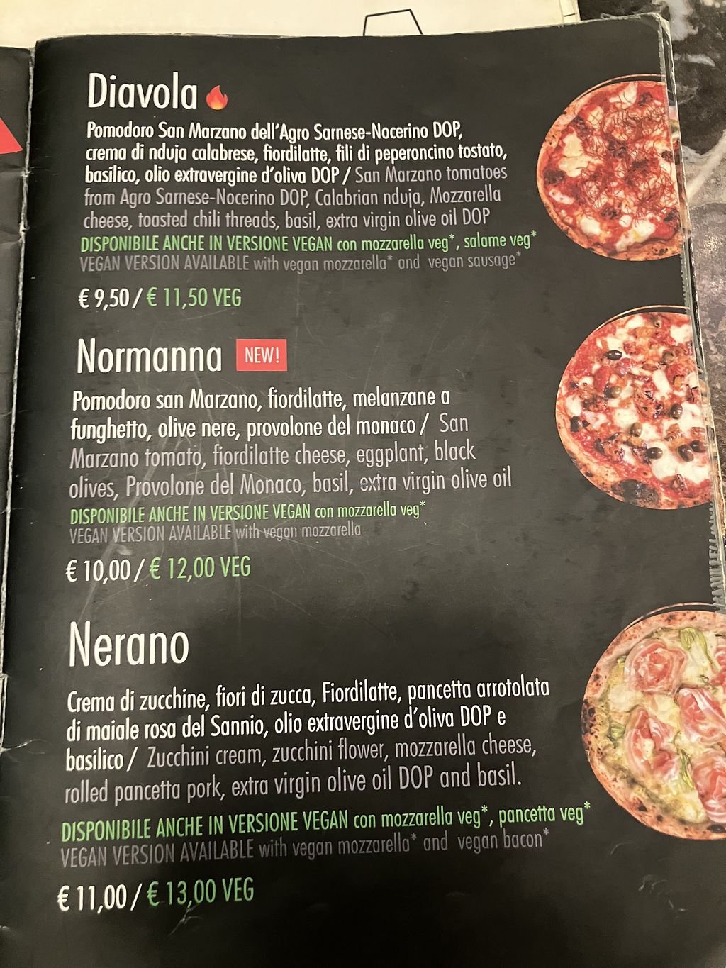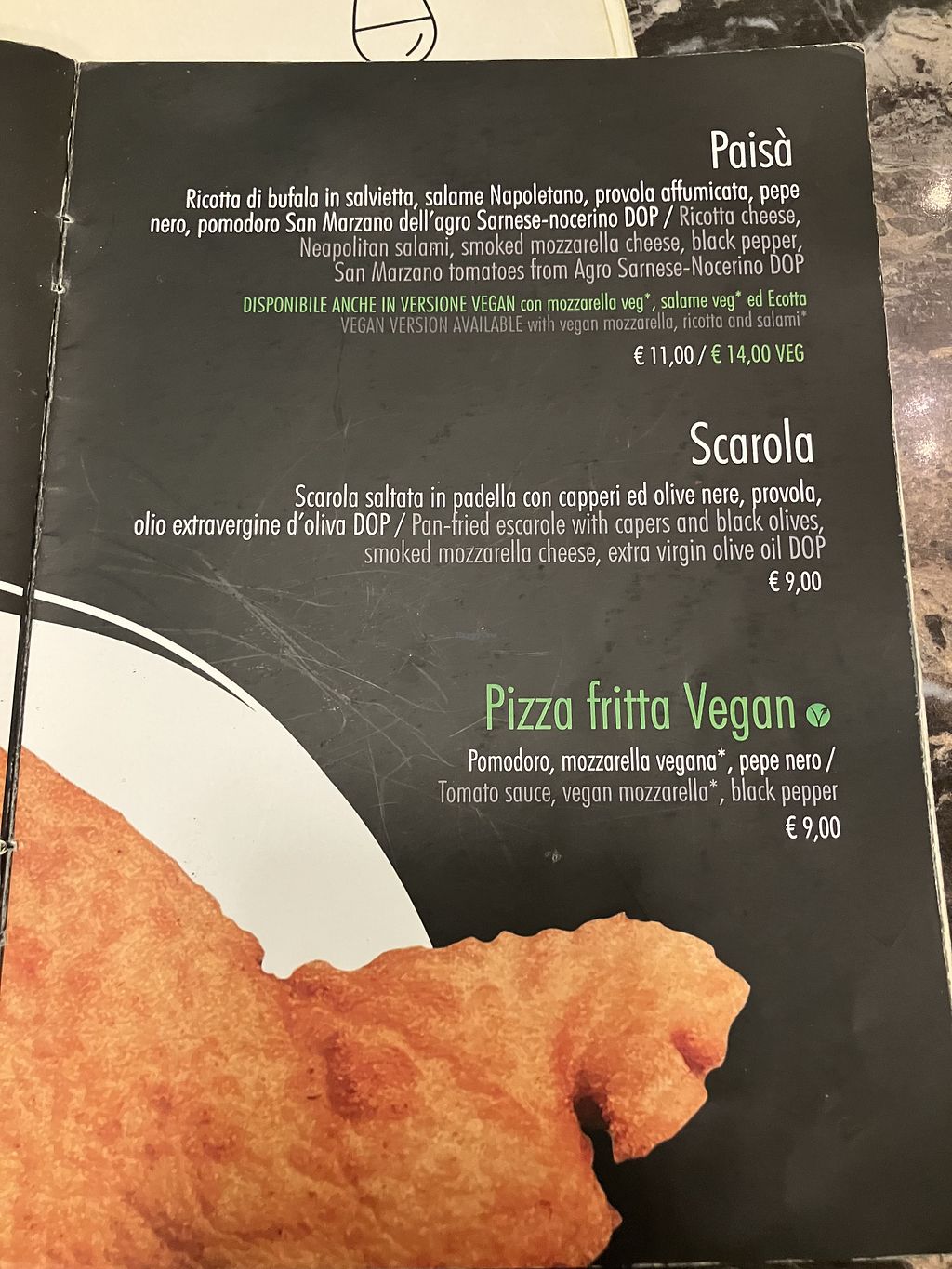 Really feel like VG options aren’t an afterthought here. Had the croquet, fried pizza ball, and diavola pizza and wow all top marks. Pizza was the best we’ve had in napoli. Cute interior staff super friendly.