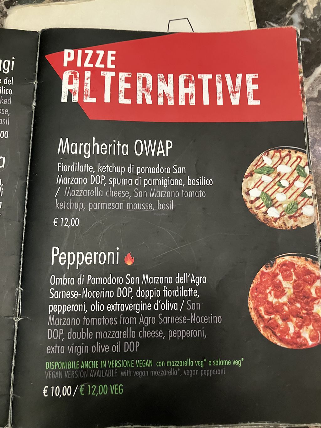 Serves meat, vegan options available. Second location. OWAP: One World All Pizzas. Restaurant offering typical contemporary Neapolitan pizza in center of city. Raw Italian materials are ingredients for an international array of pizzas. A dedicated clearly labeled vegan menu section includes several pizzas. A vegan starter (montanara) and three vegan pizzas. Open Mon-Sun 12:00-16:00, 19:00-23:30.