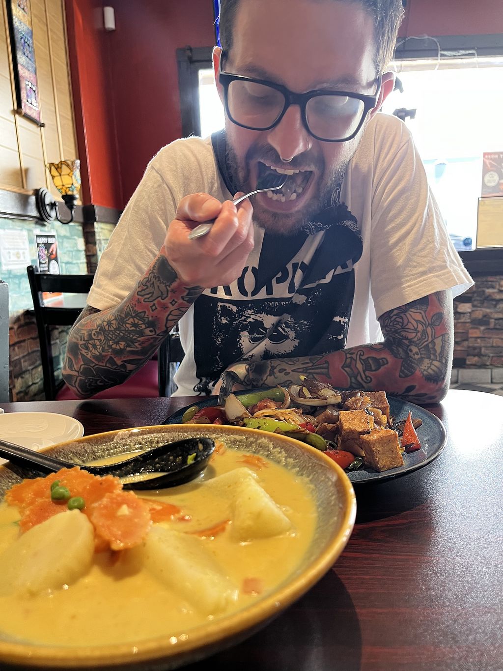 I recently started going here and have been surprised by how accommodating they are with vegans. I’ve basically been able to ask them to veganize several items in the menu (the orange tofu, yellow curry, noodles and Thai iced tea). You MUST specify you want your dish vegan. They know exactly what to do from there. It’s great! Very tasty too! The orange tofu was SO good. I can’t wait to try more things!
