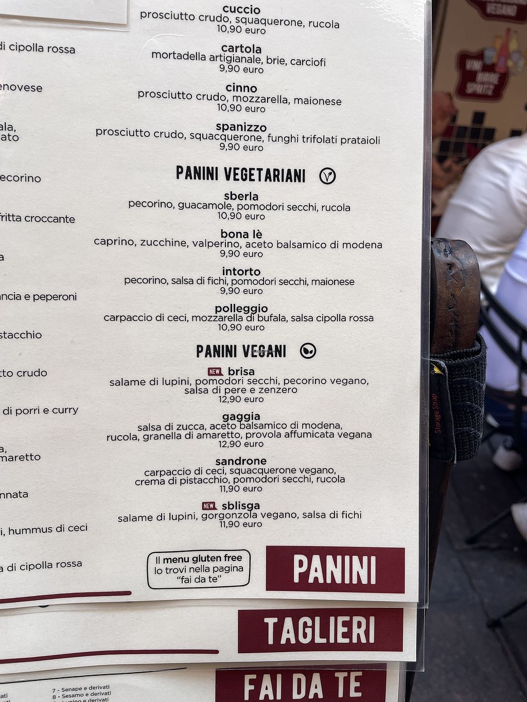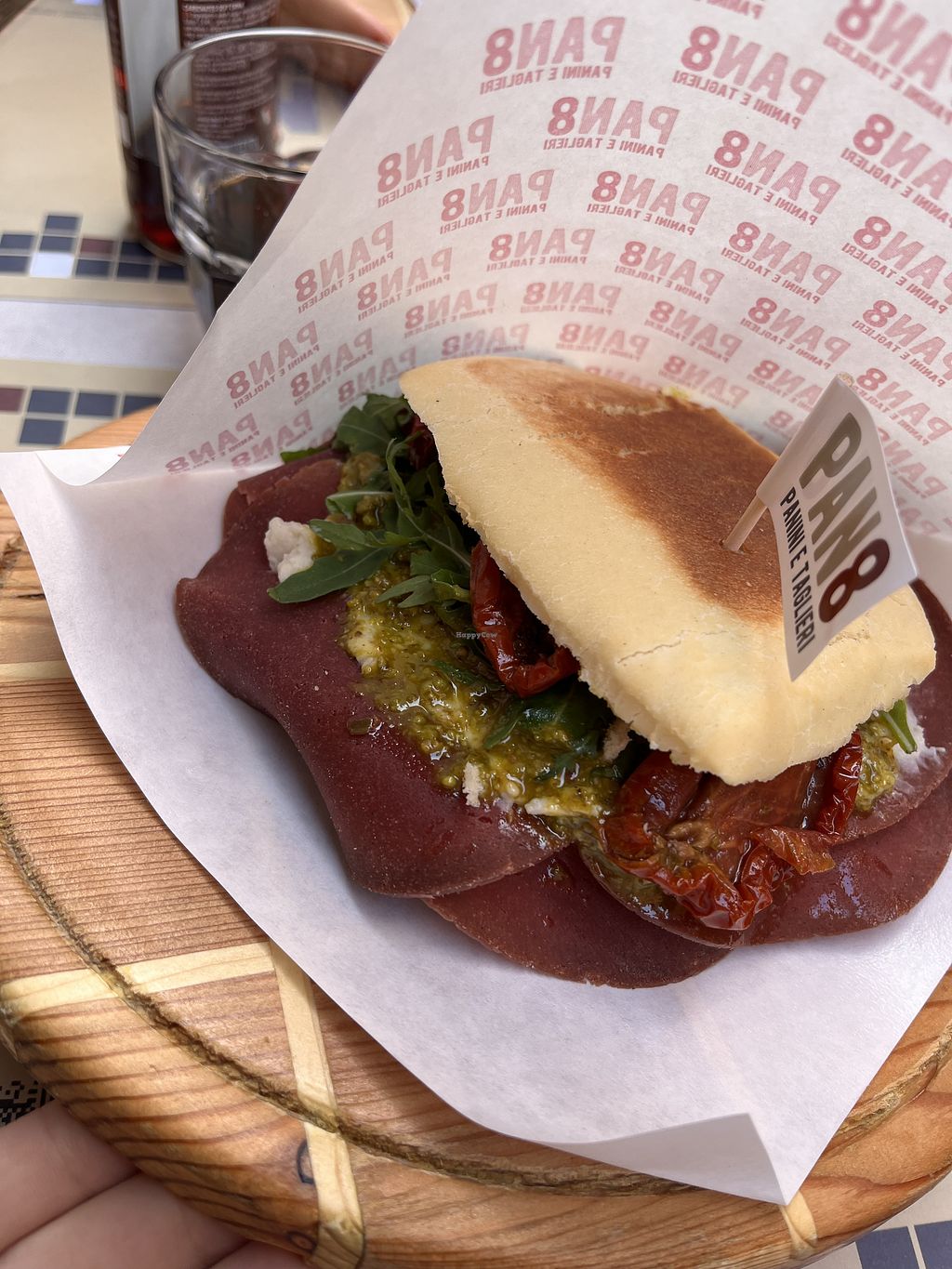 Pan8 has multiple vegan panini options and a taglieri option. The vegan meat and cheese is delicious as is the bread and condiments. Highly recommend, my favourite place so far