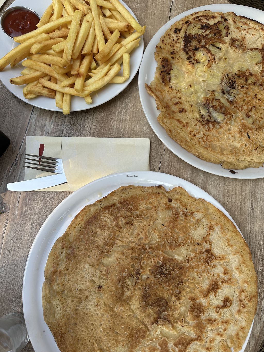 Heerlijke pannenkoeken met vegan beslag. Zoontje vroeg om friet en ze kwamen zelfs nog vragen of het oké is dat er ook vlees in dat vet gefrituurd wordt. Super netjes!