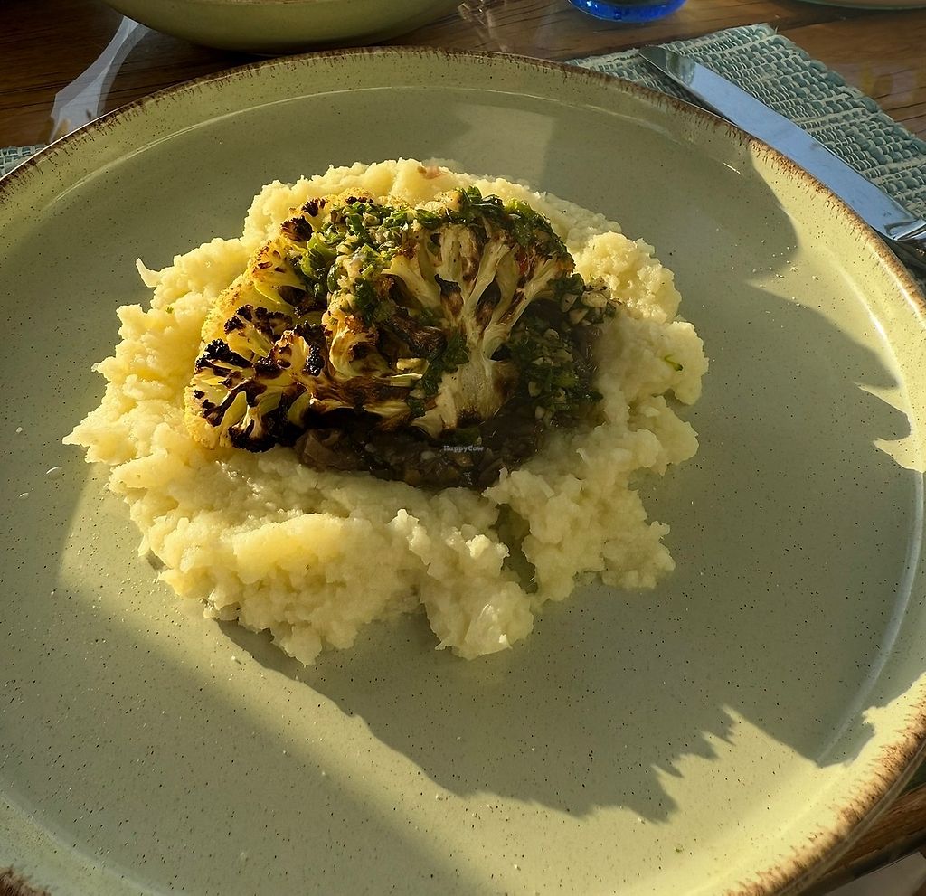 We ate outside at the dining room and it was a beautiful setting. They had a few vegan-friendly options — I tried the cauliflower steak and the falafel, which were both decent.
