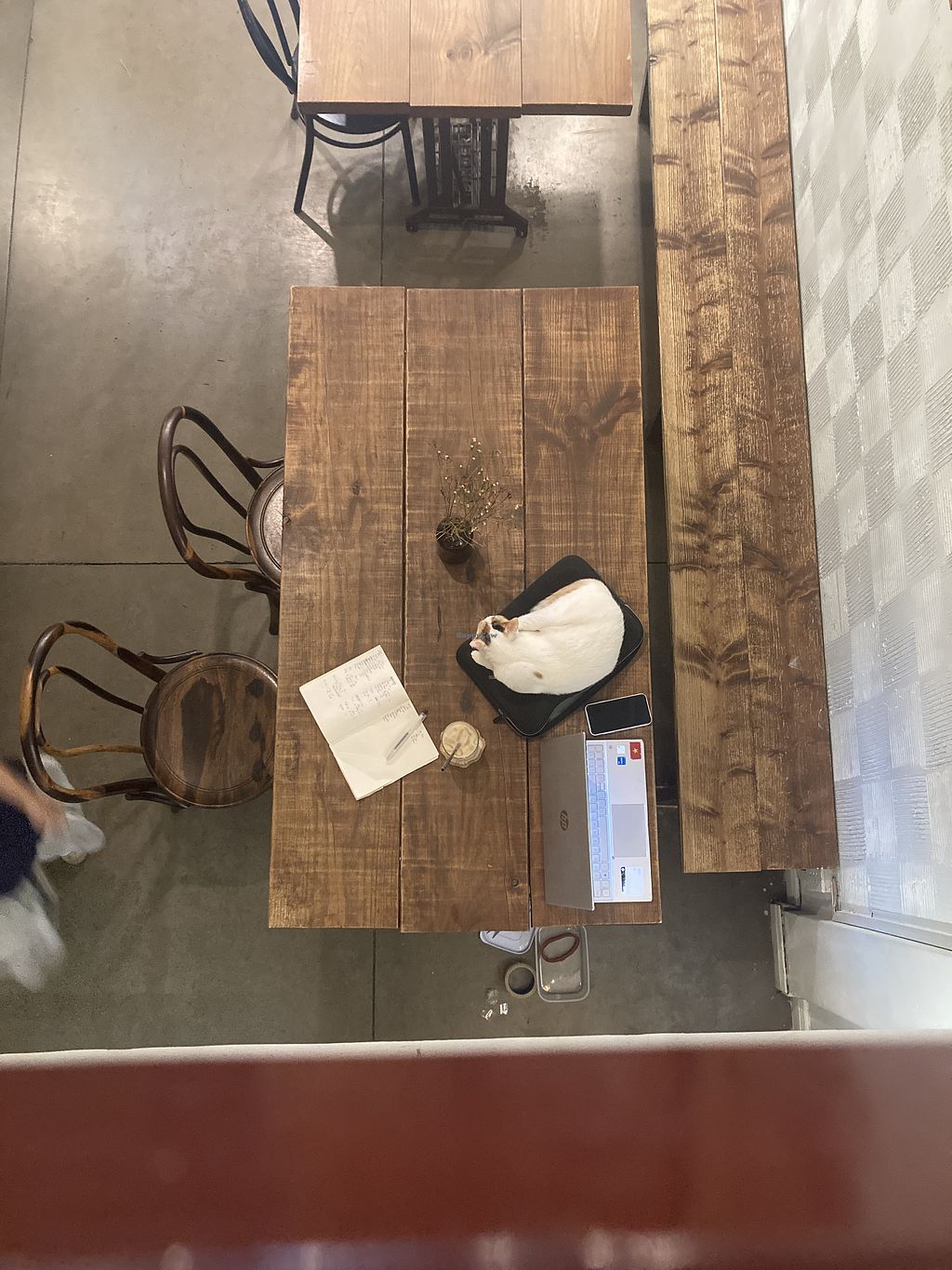 Came here expecting a cat cafe of sorts but was greeted by two yappy dogs, I absolutely love dogs usually but they really didn’t seem to warm up to me. Cats were scarce, all the downstairs tables of four were taken up by individuals working, so I went upstairs. This smelled distinctly of cat urine.