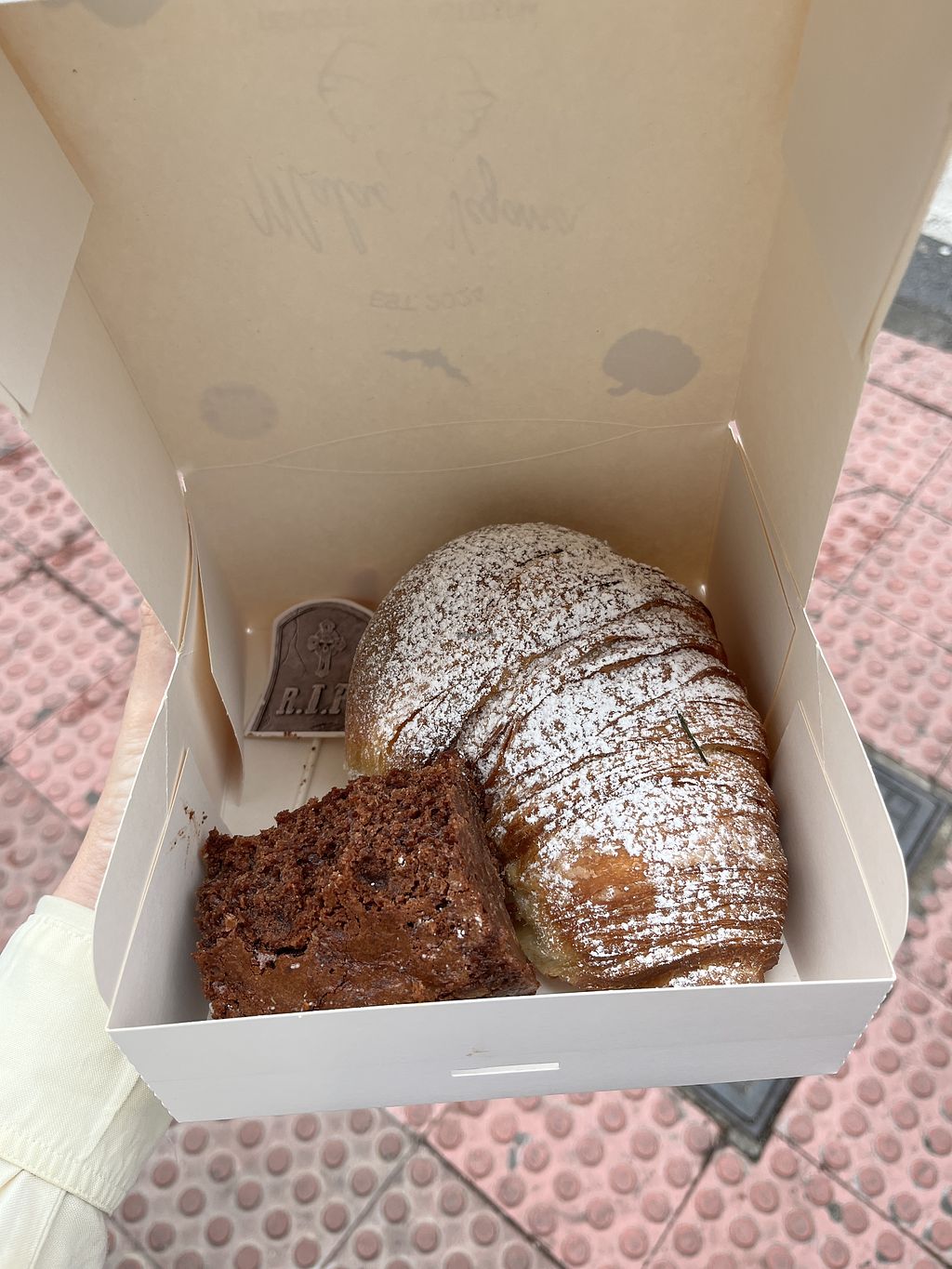 The day I went, about 50% of the offer were layered cakes with cream filling. I preferred to try various of their other sweet treats and bought a matcha white choc cookie, a NY roll filled with pistachio, a blondie, also with pistachio cream and a chocolate roll, which I didn’t get a taste of, as I gave it to a homeless, even before trying anything else. Of the rest, I really relished the pistachio cream and liked the rolled puff pastry. The blondie itself was ordinary. The cookie had an overly strong matcha flavour that was very bitter, and that being said by a huge matcha fan. But even worse, it was a disgusting excess of sweetness; my mouth was full of sugar crystals when having the first and last bite. I also didn’t like that when asking if all four pastries I chose fitted in the box, the owner confirmed, but when I opened the box in order to take a photo for HC, still being in the bakery, I saw that she carelessly pressed the goods into the box, so that they fit, smearing the pistachio cream of the blondie onto one edge, which was a shame.