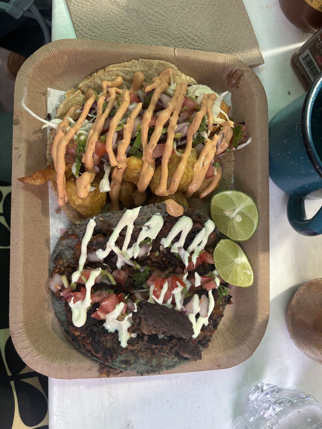 I never thought I’d get to eat street food as a vegan in CDMX so stumbling upon Paxil was a wonderful surprise. The cauliflower tacos are delicious—“bus,” as my Gen Alpha daughter said. She also got the “fish” tacos, which were a close second. I got the mushroom taco and it was quite good and probably less fat-filled than the yummier ones, which were deep fried to perfection. The sauces added a great depth of flavor.