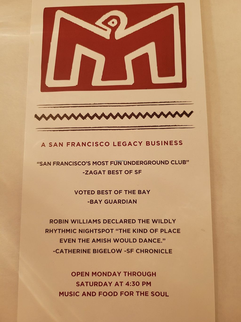 Amazing food, staff, entertainment and ambiance. I don't know how often they have live music and dancers, but my visit here was a highlight of my visit to SF.