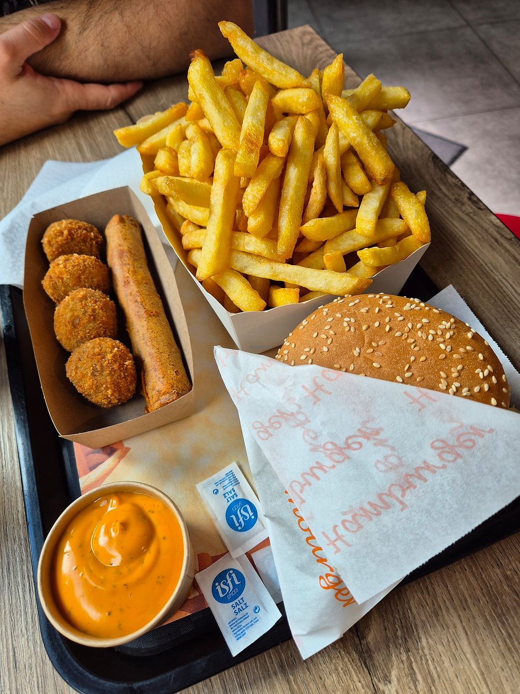 Pros: Le rapport qualité prix raisonnable , Quantité correct , Taille du paquet de frites énorme