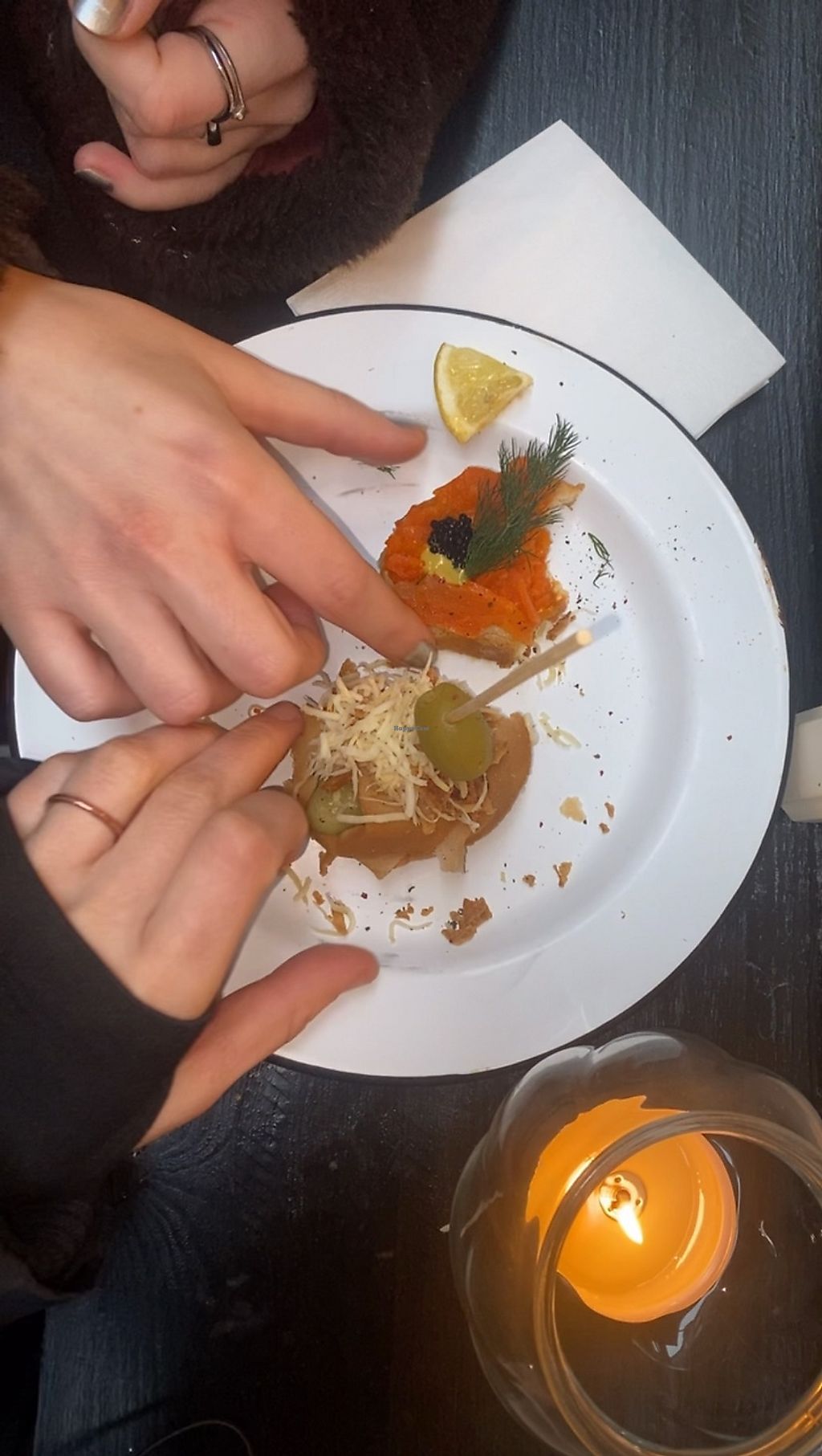 The best thing about this place is that you don't have to choose! When I arrived they had an option that's called parade of canapes where you are able to try all three of their delicious canopies with a glass of sparkling wine. They were all great but I particularly loved the one with Camembert cheese. This is one of the few places in the world where the vegan cheese really works. The carrot lox were good as well although they were just a bit salty for my taste. It was for a feast for the eyes as well as the palate as each one was beautifully plated. It's a small spot, it feels kind of like a hole in the wall even though there's definitely a gourmet deli vibe happening. I would definitely recommend coming here!