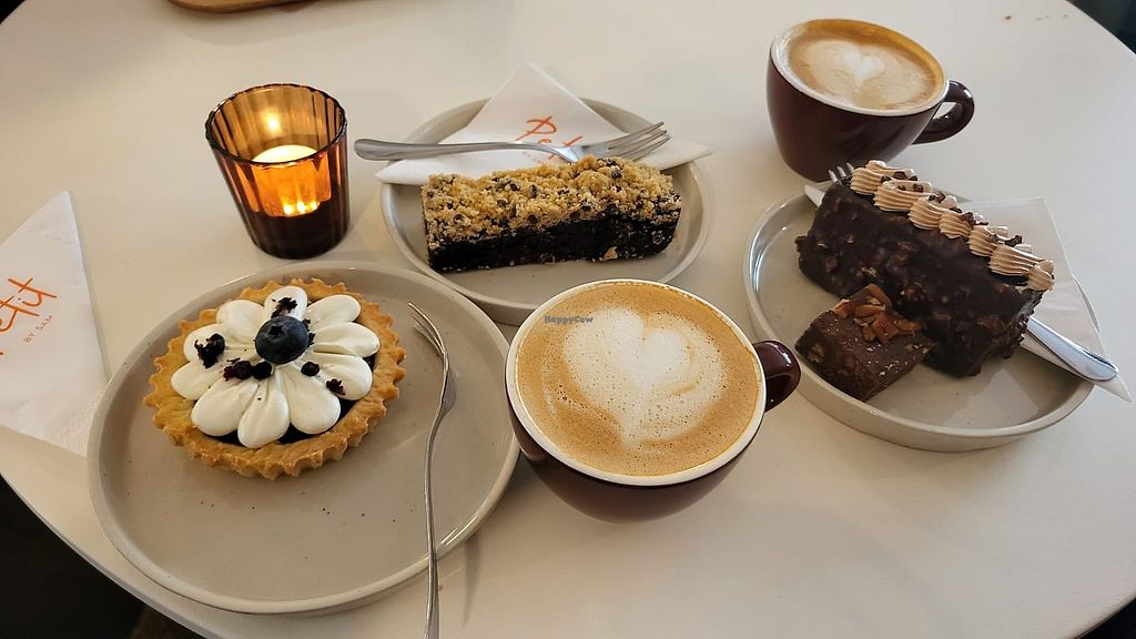 Very nice and cozy place, also children-friendly with little play area. Delicious vegan options! We had pecan fudge, praliné crunch, blueberry tart and a brookie - folks, go for it and give it a try, really so so good fine bakery, highly recommended. Staff very friendly and attentive. Coffee and Matcha were delicious as well. Decaf available.