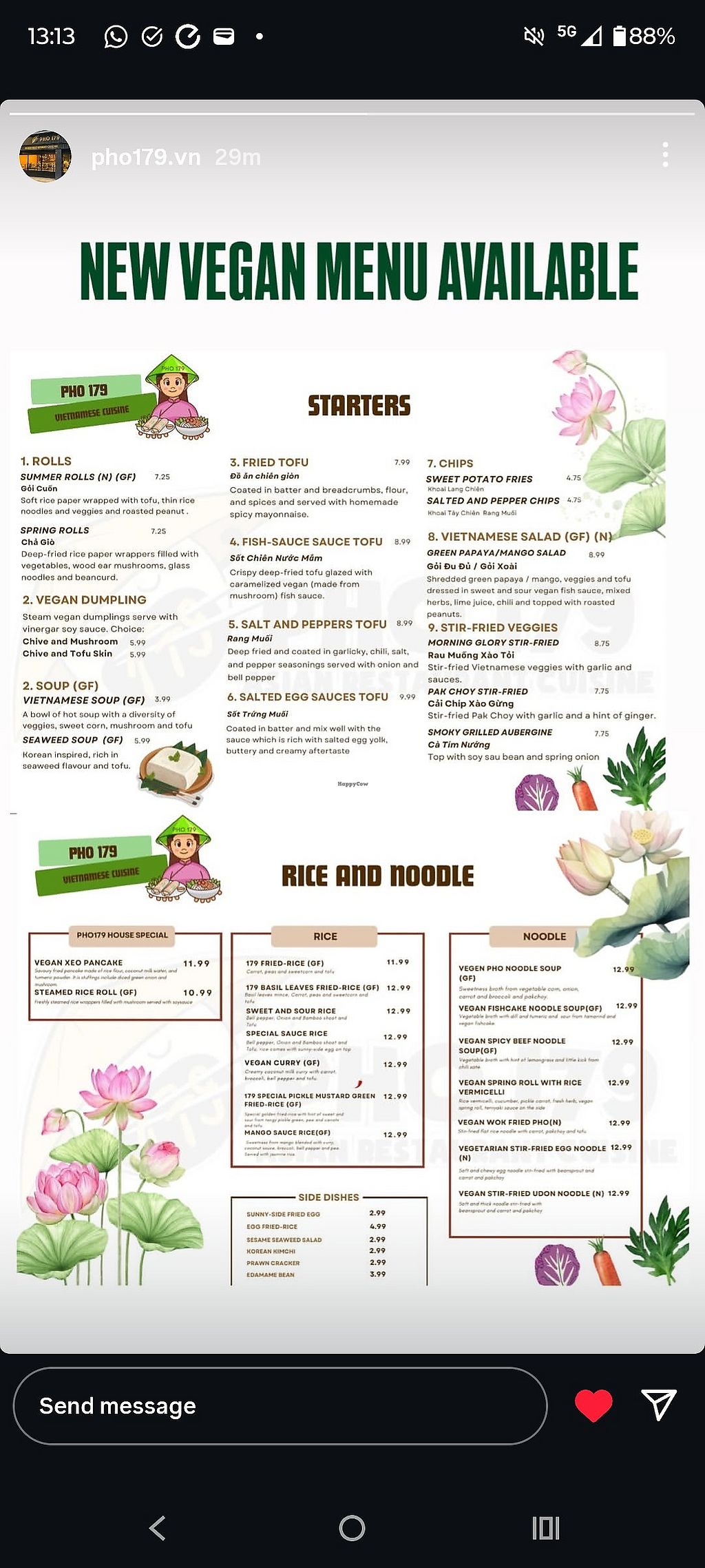 Pho 179 had a full vegetarian and vegan menu (most vegetarian options could be made vegan too). The food was delicious, fast and friendly service and a city centre location. Would definitely come back to try more of the options.