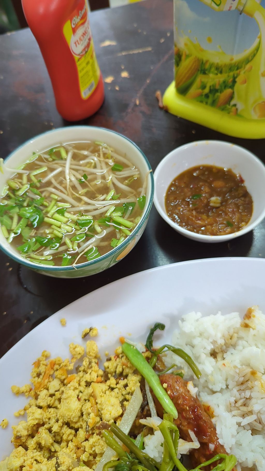 Great place with local food to sit in or take out. Lots of choice of vegetables, tofu, mock meat. Not sure what the pricing system is, but plate of rice, 5 toppings and soup for 23k