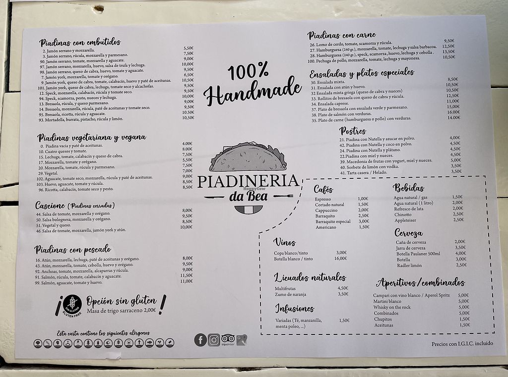 Serves meat, vegan options available. Small restaurant focused on piadinas. Offers a vegetarian section on the menu with some vegan options, including piadina with olive paté, piadina with vegetables, and lemon sorbet. Open Mon-Sun 19:30-23:30.