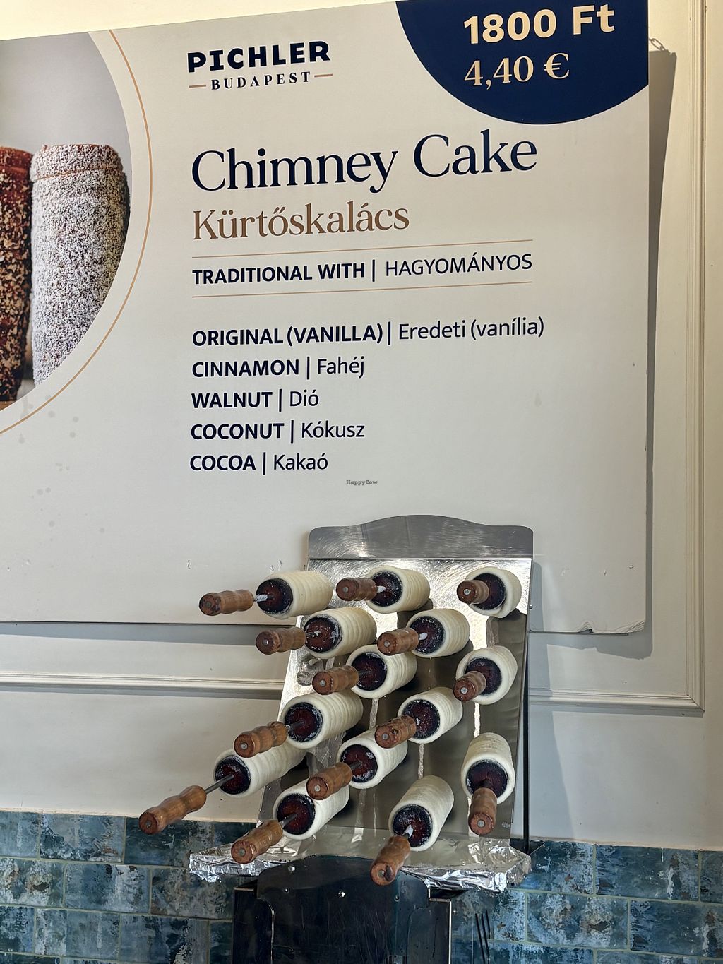 Café & bakery specialising in chimney cakes. Offers vegan chimney cakes with various fillings and sorbets. Specify vegan when ordering. Open Mon-Tue 10:00-22:00, Wed 10:00-19:00, Thu-Sun 10:00-22:00.