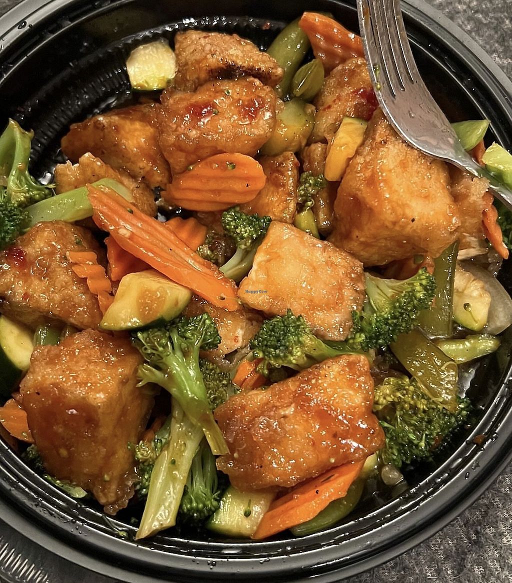 Serves meat, vegan options available. Chain restaurant serving Chinese-American foods. Vegan options include the firecracker, orange, house, and sweet & sour tofu dishes. Other vegan options include the fried spring rolls and edamame. Noodle dishes are not vegan or vegetarian.