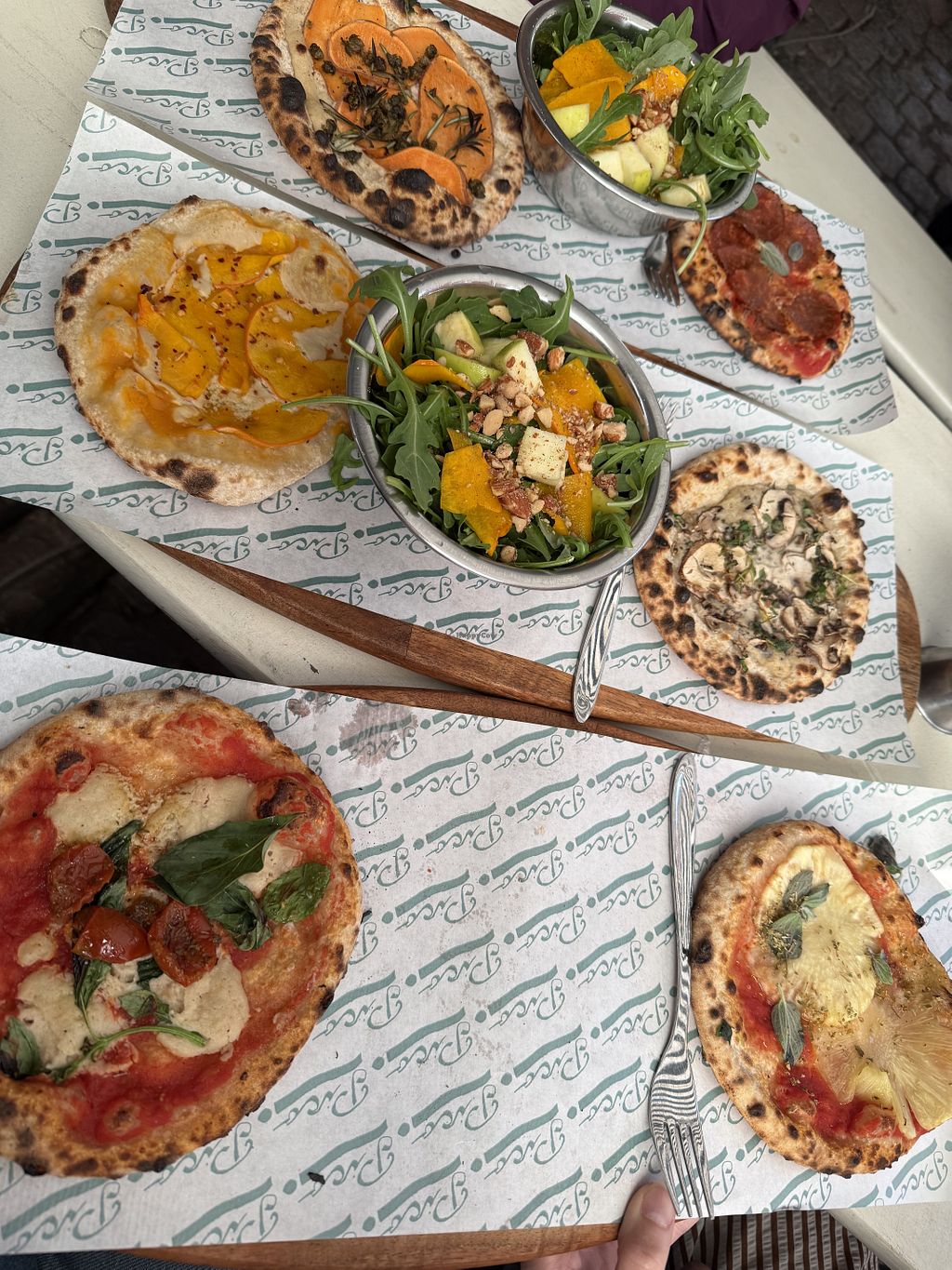 Delicious mini pizzas and a vegan seasonal salad. There were 3 of us so we were able to try all 6 vegan pizza options. The truffle and mushroom and pepperoni were my favourites.