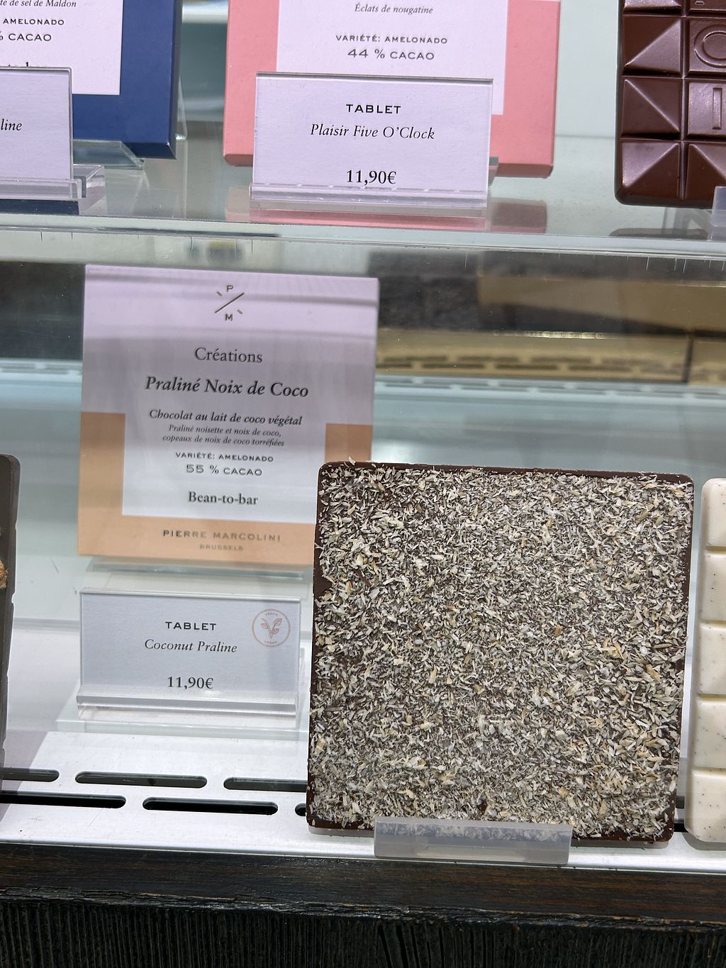 You're actually allowed to taste the different chocolate bars! They have a ton of different tasting dark chocolate bars, even a milky coconut version. Other options are stuff like orangettes or, surprisingly, candied chestnuts. These were actually soooo delicious, highly recommend. The bar was a gift so I can't give feedback on it. But it's reaaally expensive
