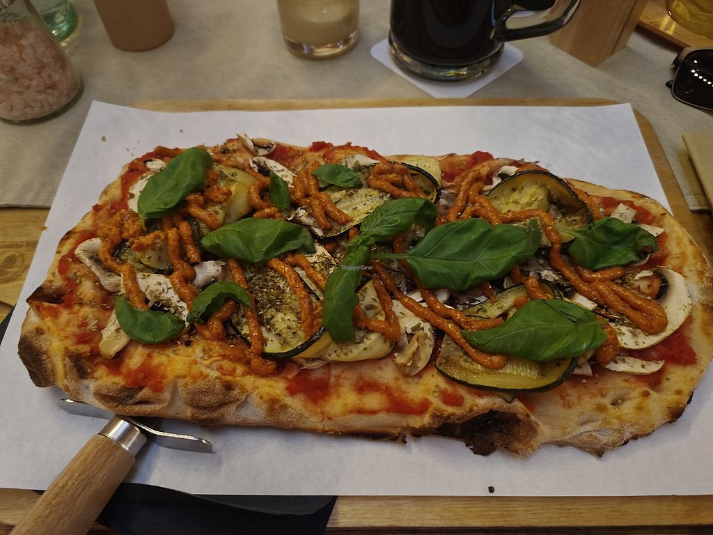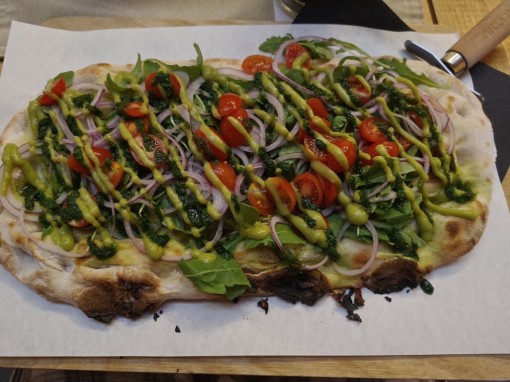 I did not know what a pinsa was but now I love it. Unfortunately only one labeled vegan option on the menu but after asking about the pinsa with olive oil and herbs, she confirmed that it was vegan too. The dough does not contain animal products.