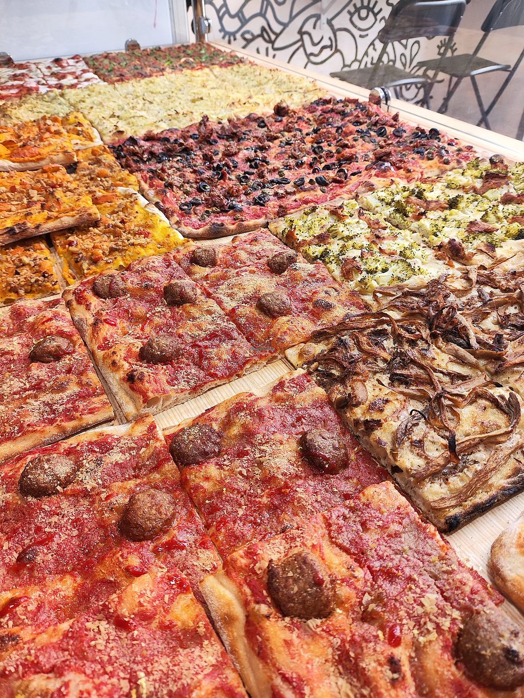 Vegan pizza restaurant serving Roman pizzas by the slice. Pizzas include flavors like marinara pizza, margherita pizza, mushroom pizza and kebab pizza. Also offers soup of the day and lasagna. Open Tue-Fri 11:00-20:00, Sat 12:00-20:00. Closed Sun & Mon. Hours are subject to change - check Instagram.