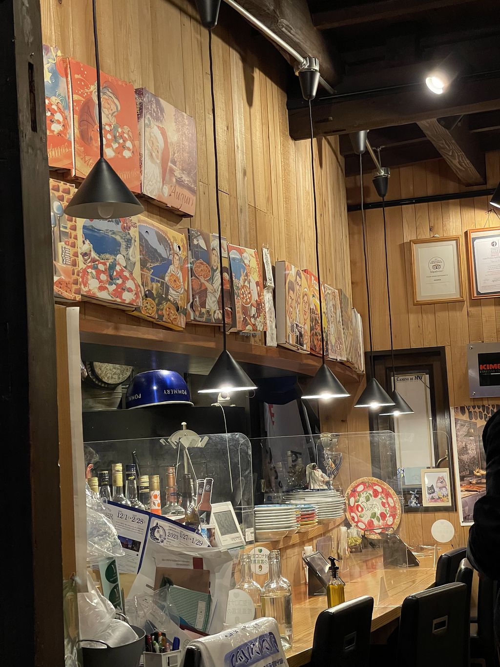 The place is the perfect mix between a Japanese restaurant with the typical counter in front of the kitchen, and an Italian restaurant, with a big pizza oven. The cook accepted to do a pizza without cheese and with a variety of vegetables, it was delicious. The dough was great, I really recommend.