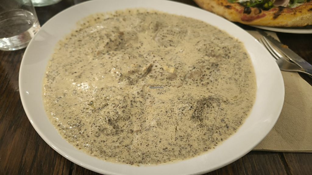 Raviolis de hongos, pizza de mortadela y caponata de verduras con polenta. Todo en general muy bueno. A los raviolis con menos salsa creo que mejor y la caponata, la base de polenta, al freirla se queda un poco aceitosa. La pizza de mortadela rica y sin queso Vegan. No hace falta queso imitación para que una pizza esté rica. Ya habíamos estado hace años y la vuelta ha sido buena. Recomendable