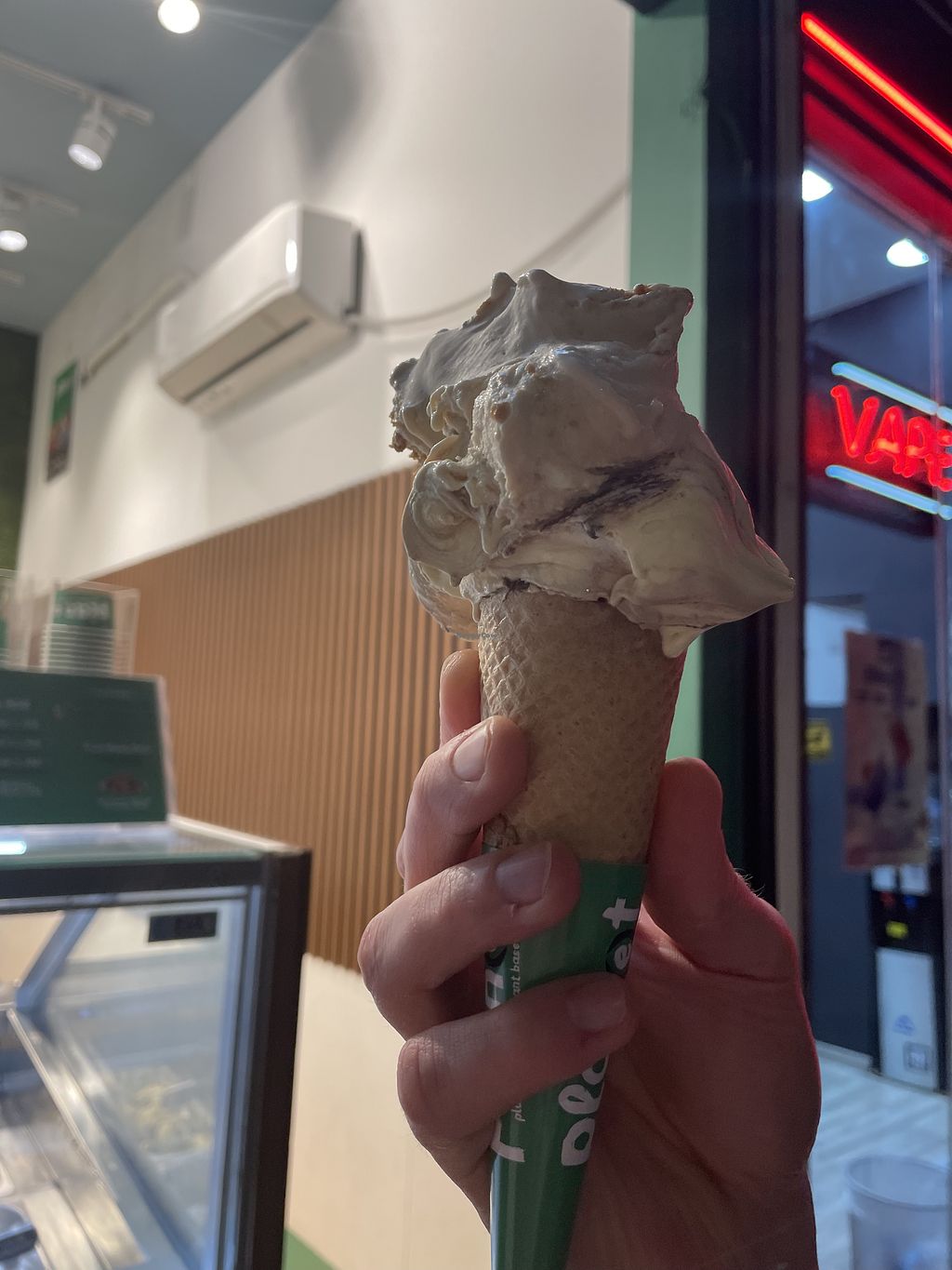Stumbled upon this store and saw the vegan slogans. Had two scoops of vegan ice cream (coconut chocolate & lotus). Was quite nice and the guy behind the counter was super friendly. Payment by card was out of order. Price is actually insane but I enjoyed my treat anyways.