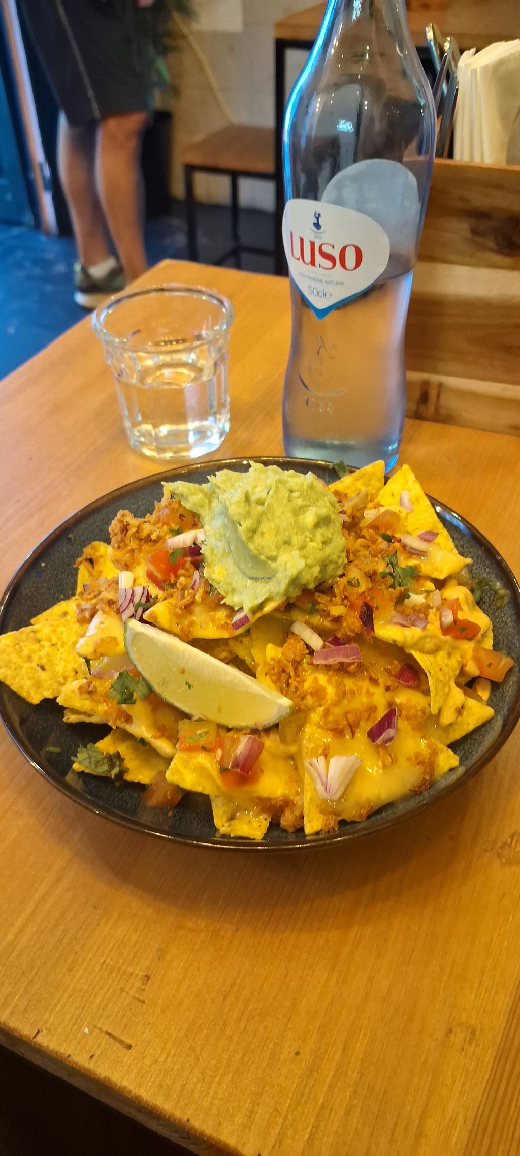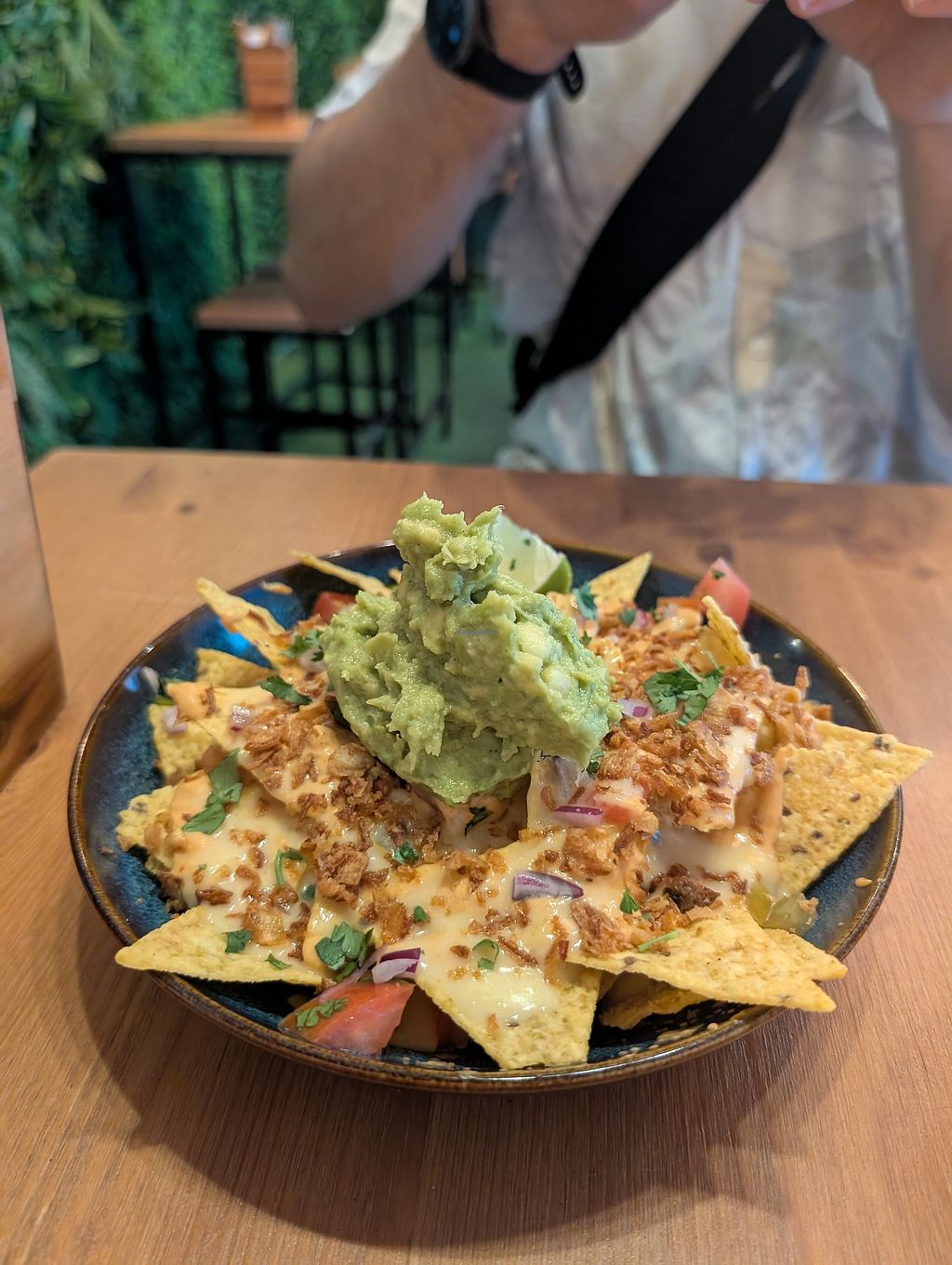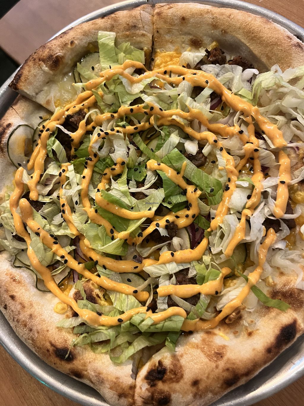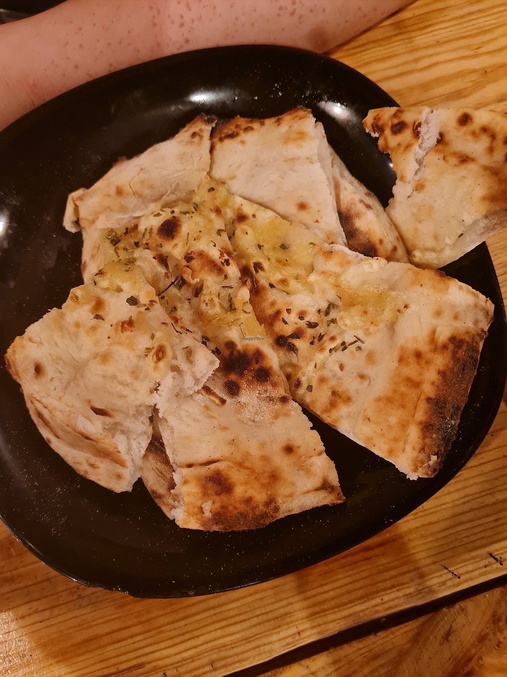 Clockwise L-R: chickpea tacos, spicy seitan tacos, garlic bread, mac'…