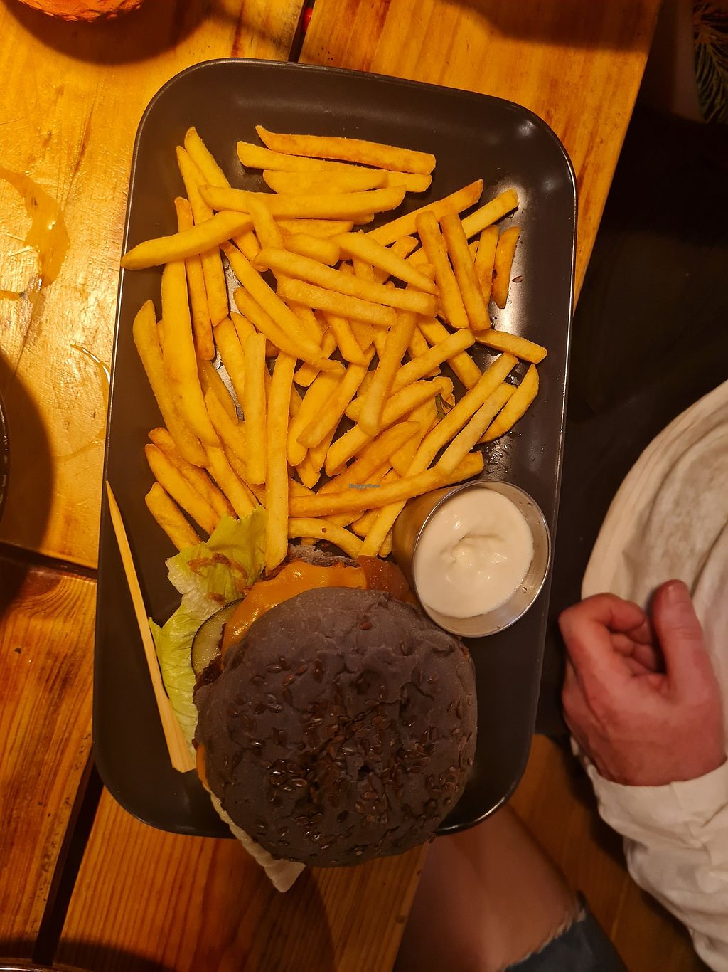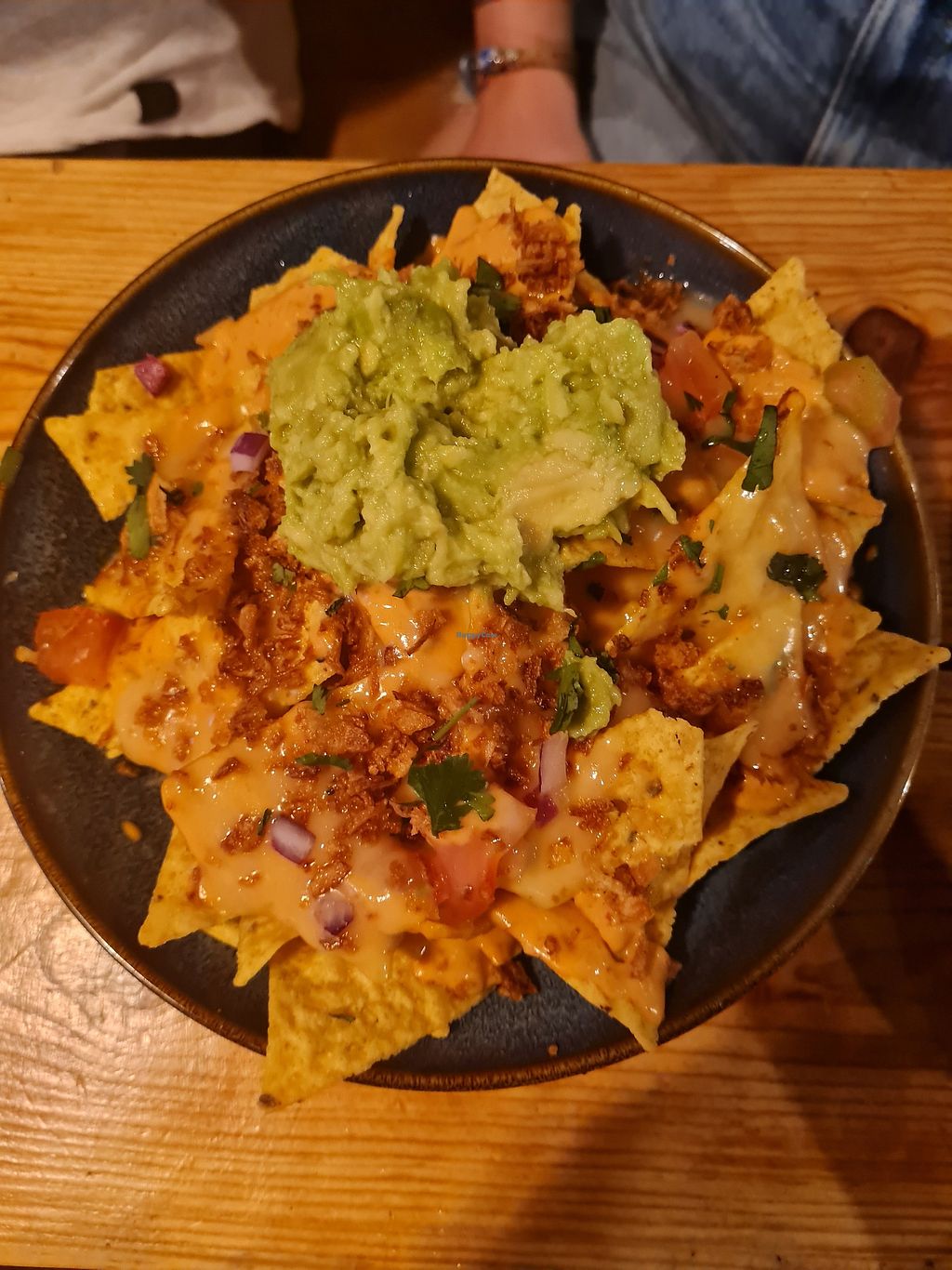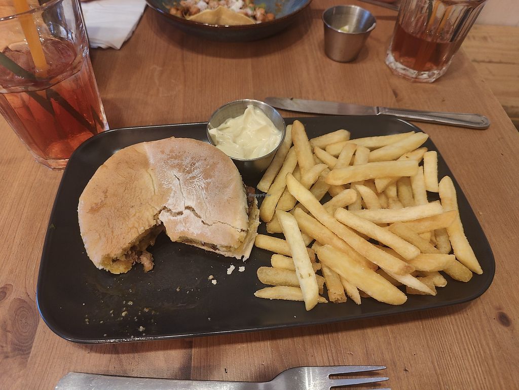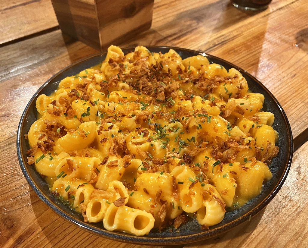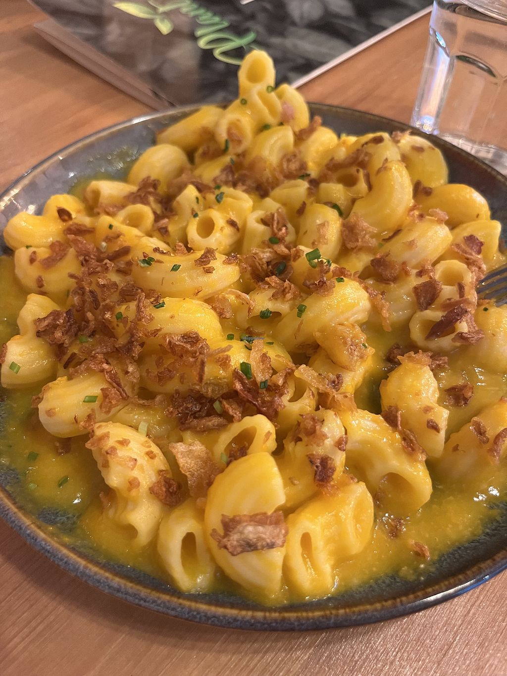 Clockwise L-R: chickpea tacos, spicy seitan tacos, garlic bread, mac'…