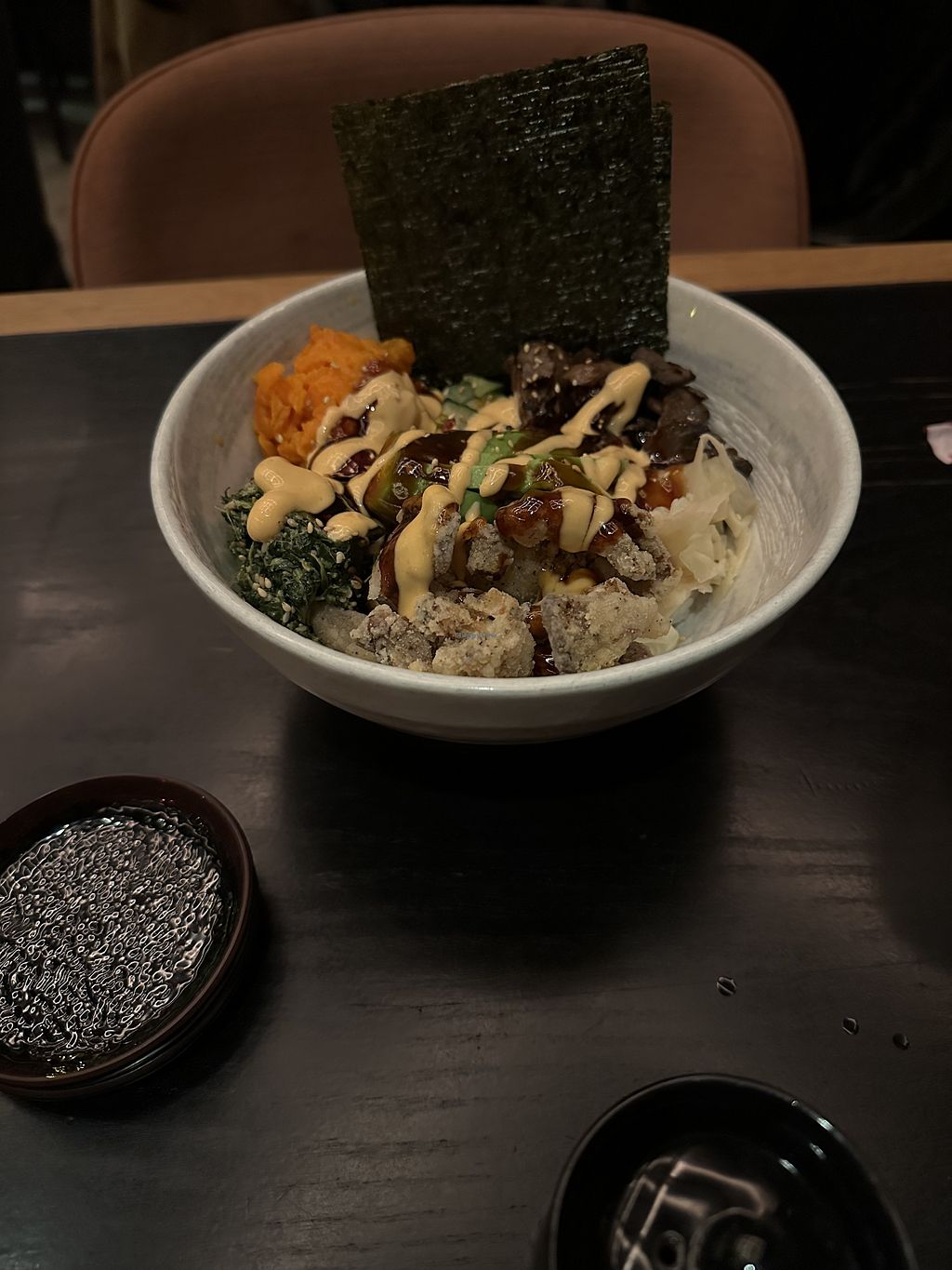 Started with the portobello nigiri- great start! Sprinkled with just the right amount of wasabi powder (for those of us who don’t tolerate heat well) and extra wasabi on the side (for those that can handle it). I had the Poke Bowl - so much going on in there! Chunchy fried mushrooms; creamy avocado; spicy mayo - so good!