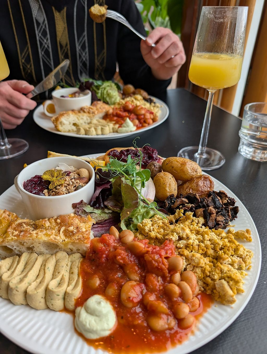 Had the weekend brunch plate today and it was UNREAL!!!! So much variety, such incredible flavor, and all 100% vegan! Definitely check out their cakes, cinnamon rolls, cheesy rolls, coffee, & tea, too. It was an outstanding meal — also with good views of Hallgrimskirkja over the lake! Our fave meal we had while in Iceland for two weeks!