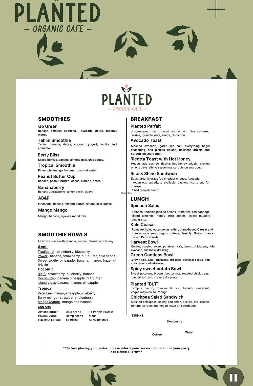 I am thrilled beyond thrilled that an almost fully plant based restaurant has landed in Melrose!! Their menu consists of fresh, organic, and delicious bowls, smoothies, and sandwiches. The only item on the menu that is not vegan is the egg sandwich, however vegan egg and cheese can be substituted, and tempeh bacon added. They also use honey on their ricotta (cashew) toast, however a few of their smoothies contain agave, which is available as well. I've been to the cafe three times since they opened recently and have found everything to be superbly flavorful. The Harvest Bowl and the Chickpea Salad sandwich were both delicious, and the Tahini Smoothie felt like an indulgence! I'm so excited to support this new, local cafe!