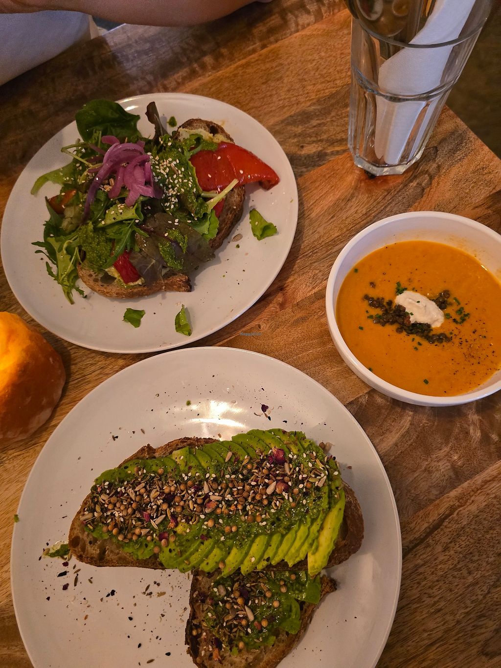 Wir waren gegen Mittag vor Ort und haben ein Avocadobrot mit Kürbis gegessen.