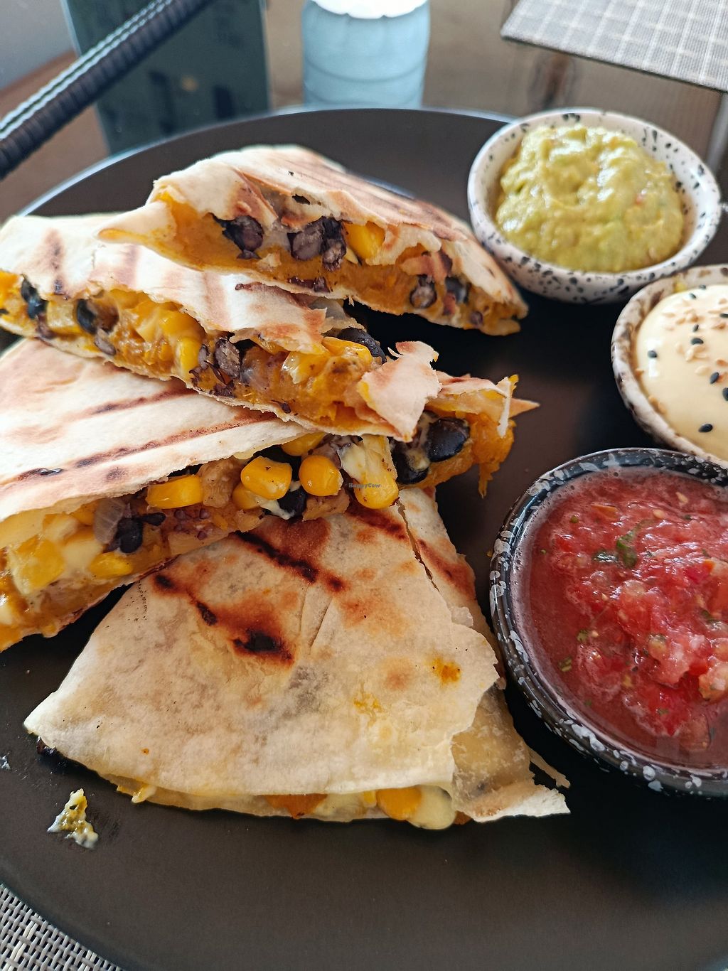Back to front: iced oat latte, vegan quesadilla, fried (cashew) "chees…