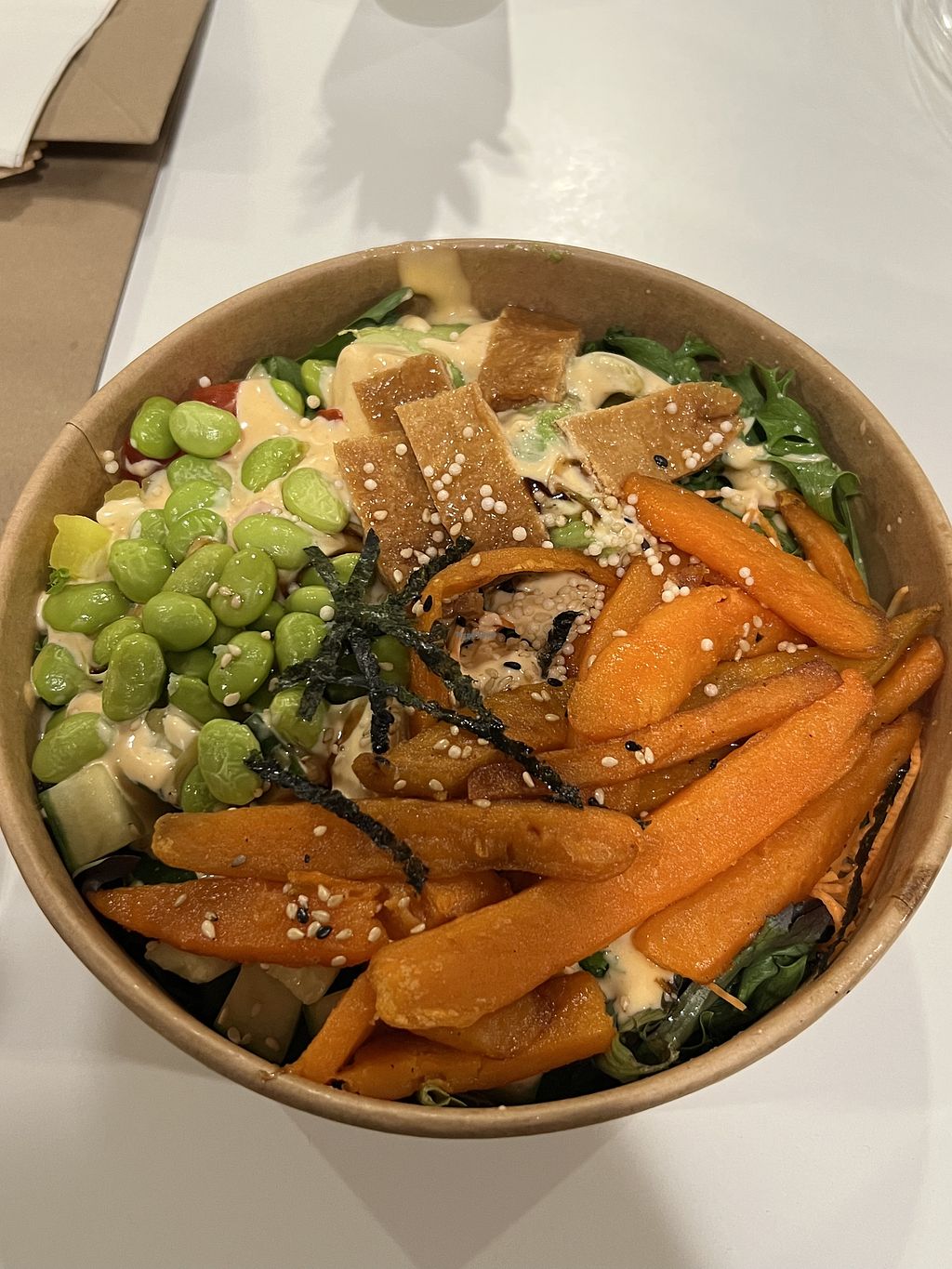 Serves meat, vegan options available. Poke restaurant offering veganizable miso ramen (confirm vegan broth), vegetable or tofu poke bowls (request vegan sauces), spicy edamame, pickled daikon, and vegetarian pot stickers (request vegan wrapper and filling). Open Mon-Sun 11:00am-8:00pm.