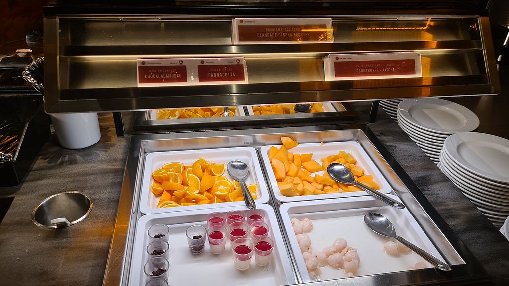 Ate at their buffé, which has a vegan section. Everything is very clearly labelled, although some descriptions of the food didn't seem to match with the food offered. Only food that was not labeled, but when I asked the woman behind the disk she very helpfully pointed me towards the two vegan options. Sadly not many vegan desert options, only fruit