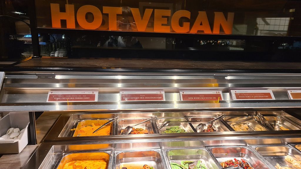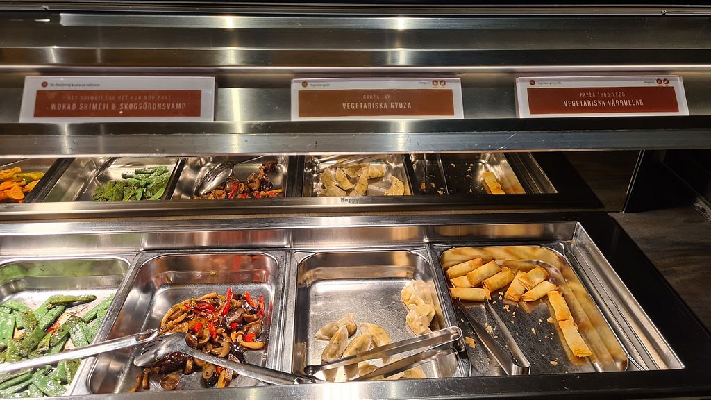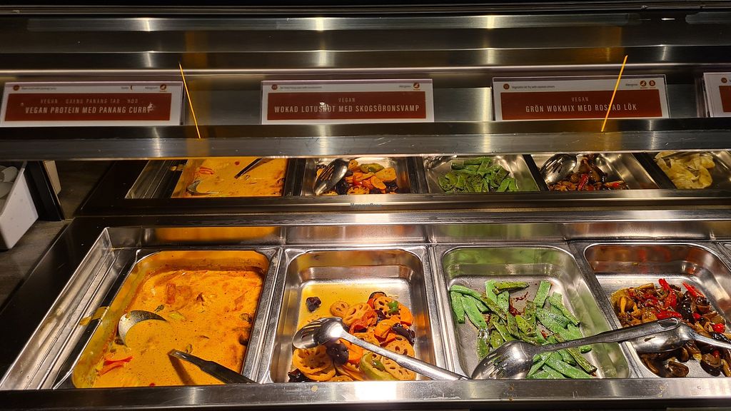 Serves meat, vegan options available. Pan-Asian wok and buffet eatery. Buffet items are clearly labeled and include a variety of vegan choices. Offers tofu and Oumph as choice of protein. Also has vegan curries, sushi, and poke bowls. Staff are vegan-aware. The restaurant has its own veragn versions of oyster sauce, fish sauce, and curry paste. Please note that many businesses in Sweden are cashless. Open Mon-Thu 10:30-21:00, Fri 10:30-23:00, Sat 11:00-23:00, Sun 11:00-21:00.