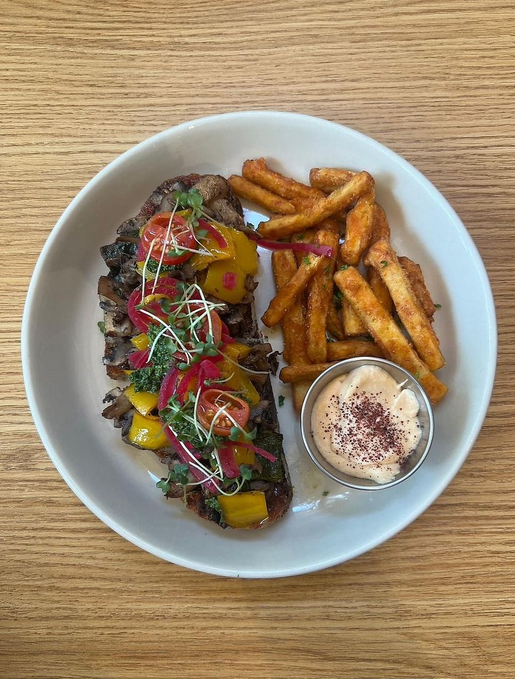 Serves meat, vegan options available. Branch of a health food restaurant serving farm to table dishes like bowls, wraps, sandwiches, and field trays. Vegan options are clearly labeled. Most salads can be made vegan and the chef can prepare more vegan options on request. Choices include sabbaba wrap tray, gutsy salad, donburi bowl, and a field plate. Open Mon-Sun 11:00am-11:00pm.