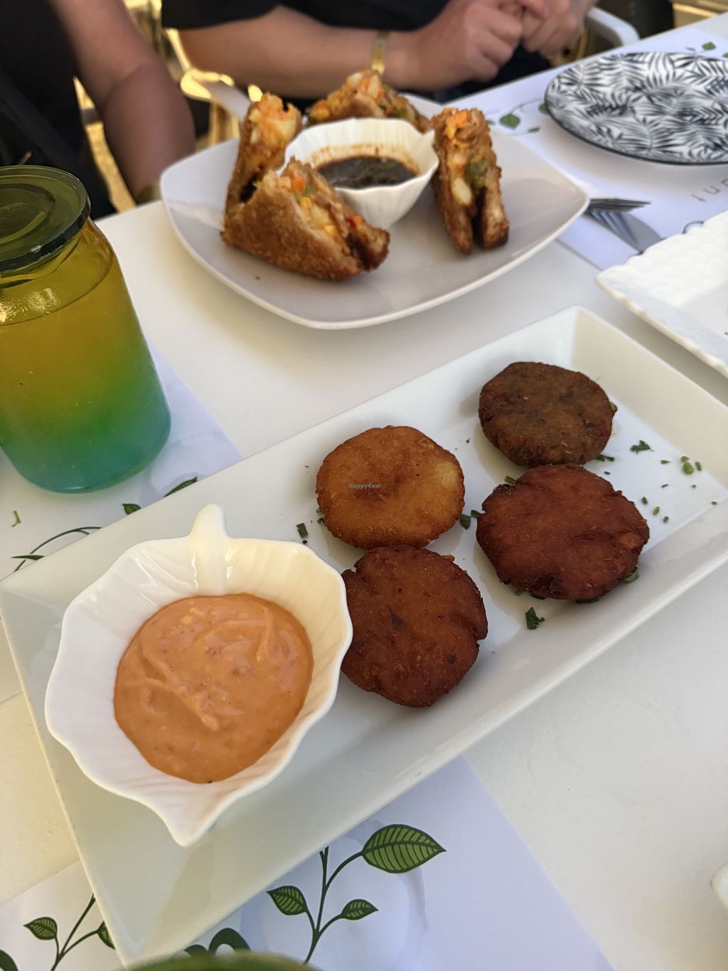 Tzatziki with pita and zucchini in beer batter.